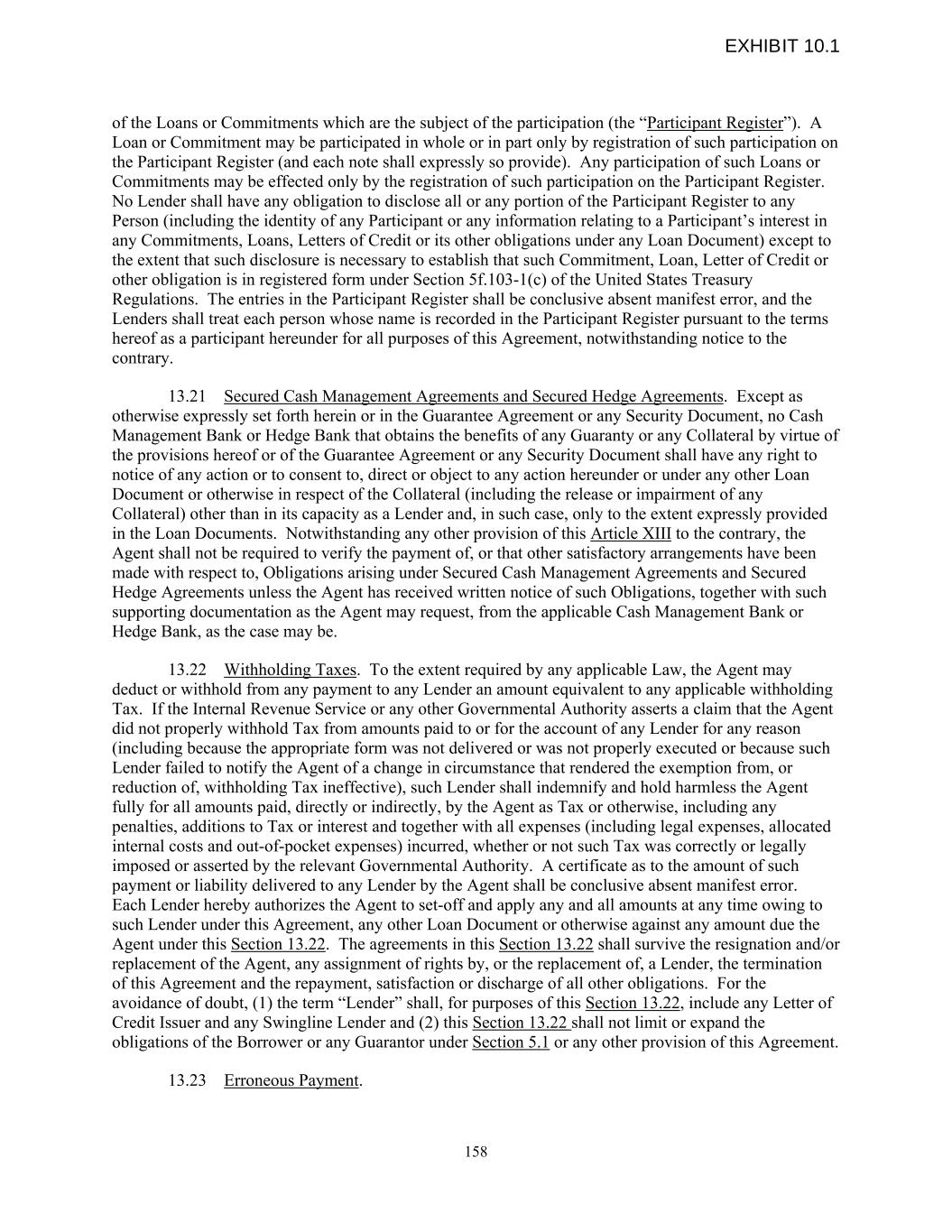 of the Loans or Commitments which are the subject of the participation (the “Participant Register”). A Loan or Commitment may be participated in whole or in part only by registration of such participation on the Participant Register (and each note shall expressly so provide). Any participation of such Loans or Commitments may be effected only by the registration of such participation on the Participant Register. No Lender shall have any obligation to disclose all or any portion of the Participant Register to any Person (including the identity of any Participant or any information relating to a Participant’s interest in any Commitments, Loans, Letters of Credit or its other obligations under any Loan Document) except to the extent that such disclosure is necessary to establish that such Commitment, Loan, Letter of Credit or other obligation is in registered form under Section 5f.103-1(c) of the United States Treasury Regulations. The entries in the Participant Register shall be conclusive absent manifest error, and the Lenders shall treat each person whose name is recorded in the Participant Register pursuant to the terms hereof as a participant hereunder for all purposes of this Agreement, notwithstanding notice to the contrary. 13.21 Secured Cash Management Agreements and Secured Hedge Agreements. Except as otherwise expressly set forth herein or in the Guarantee Agreement or any Security Document, no Cash Management Bank or Hedge Bank that obtains the benefits of any Guaranty or any Collateral by virtue of the provisions hereof or of the Guarantee Agreement or any Security Document shall have any right to notice of any action or to consent to, direct or object to any action hereunder or under any other Loan Document or otherwise in respect of the Collateral (including the release or impairment of any Collateral) other than in its capacity as a Lender and, in such case, only to the extent expressly provided in the Loan Documents. Notwithstanding any other provision of this Article XIII to the contrary, the Agent shall not be required to verify the payment of, or that other satisfactory arrangements have been made with respect to, Obligations arising under Secured Cash Management Agreements and Secured Hedge Agreements unless the Agent has received written notice of such Obligations, together with such supporting documentation as the Agent may request, from the applicable Cash Management Bank or Hedge Bank, as the case may be. 13.22 Withholding Taxes. To the extent required by any applicable Law, the Agent may deduct or withhold from any payment to any Lender an amount equivalent to any applicable withholding Tax. If the Internal Revenue Service or any other Governmental Authority asserts a claim that the Agent did not properly withhold Tax from amounts paid to or for the account of any Lender for any reason (including because the appropriate form was not delivered or was not properly executed or because such Lender failed to notify the Agent of a change in circumstance that rendered the exemption from, or reduction of, withholding Tax ineffective), such Lender shall indemnify and hold harmless the Agent fully for all amounts paid, directly or indirectly, by the Agent as Tax or otherwise, including any penalties, additions to Tax or interest and together with all expenses (including legal expenses, allocated internal costs and out-of-pocket expenses) incurred, whether or not such Tax was correctly or legally imposed or asserted by the relevant Governmental Authority. A certificate as to the amount of such payment or liability delivered to any Lender by the Agent shall be conclusive absent manifest error. Each Lender hereby authorizes the Agent to set-off and apply any and all amounts at any time owing to such Lender under this Agreement, any other Loan Document or otherwise against any amount due the Agent under this Section 13.22. The agreements in this Section 13.22 shall survive the resignation and/or replacement of the Agent, any assignment of rights by, or the replacement of, a Lender, the termination of this Agreement and the repayment, satisfaction or discharge of all other obligations. For the avoidance of doubt, (1) the term “Lender” shall, for purposes of this Section 13.22, include any Letter of Credit Issuer and any Swingline Lender and (2) this Section 13.22 shall not limit or expand the obligations of the Borrower or any Guarantor under Section 5.1 or any other provision of this Agreement. 13.23 Erroneous Payment. 158 EXHIBIT 10.1