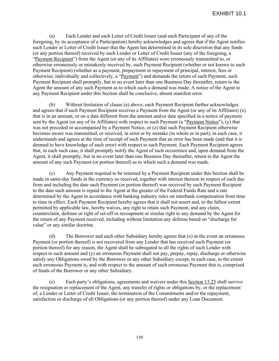 (a) Each Lender and each Letter of Credit Issuer (and each Participant of any of the foregoing, by its acceptance of a Participation) hereby acknowledges and agrees that if the Agent notifies such Lender or Letter of Credit Issuer that the Agent has determined in its sole discretion that any funds (or any portion thereof) received by such Lender or Letter of Credit Issuer (any of the foregoing, a “Payment Recipient”) from the Agent (or any of its Affiliates) were erroneously transmitted to, or otherwise erroneously or mistakenly received by, such Payment Recipient (whether or not known to such Payment Recipient) (whether as a payment, prepayment or repayment of principal, interest, fees or otherwise; individually and collectively, a “Payment”) and demands the return of such Payment, such Payment Recipient shall promptly, but in no event later than one Business Day thereafter, return to the Agent the amount of any such Payment as to which such a demand was made. A notice of the Agent to any Payment Recipient under this Section shall be conclusive, absent manifest error. (b) Without limitation of clause (a) above, each Payment Recipient further acknowledges and agrees that if such Payment Recipient receives a Payment from the Agent (or any of its Affiliates) (x) that is in an amount, or on a date different from the amount and/or date specified in a notice of payment sent by the Agent (or any of its Affiliates) with respect to such Payment (a “Payment Notice”), (y) that was not preceded or accompanied by a Payment Notice, or (z) that such Payment Recipient otherwise becomes aware was transmitted, or received, in error or by mistake (in whole or in part), in each case, it understands and agrees at the time of receipt of such Payment that an error has been made (and that it is deemed to have knowledge of such error) with respect to such Payment. Each Payment Recipient agrees that, in each such case, it shall promptly notify the Agent of such occurrence and, upon demand from the Agent, it shall promptly, but in no event later than one Business Day thereafter, return to the Agent the amount of any such Payment (or portion thereof) as to which such a demand was made. (c) Any Payment required to be returned by a Payment Recipient under this Section shall be made in same-day funds in the currency so received, together with interest thereon in respect of each day from and including the date such Payment (or portion thereof) was received by such Payment Recipient to the date such amount is repaid to the Agent at the greater of the Federal Funds Rate and a rate determined by the Agent in accordance with banking industry rules on interbank compensation from time to time in effect. Each Payment Recipient hereby agrees that it shall not assert and, to the fullest extent permitted by applicable law, hereby waives, any right to retain such Payment, and any claim, counterclaim, defense or right of set-off or recoupment or similar right to any demand by the Agent for the return of any Payment received, including without limitation any defense based on “discharge for value” or any similar doctrine. (d) The Borrower and each other Subsidiary hereby agrees that (x) in the event an erroneous Payment (or portion thereof) is not recovered from any Lender that has received such Payment (or portion thereof) for any reason, the Agent shall be subrogated to all the rights of such Lender with respect to such amount and (y) an erroneous Payment shall not pay, prepay, repay, discharge or otherwise satisfy any Obligations owed by the Borrower or any other Subsidiary except, in each case, to the extent such erroneous Payment is, and with respect to the amount of such erroneous Payment that is, comprised of funds of the Borrower or any other Subsidiary. (e) Each party’s obligations, agreements and waivers under this Section 13.23 shall survive the resignation or replacement of the Agent, any transfer of rights or obligations by, or the replacement of, a Lender or Letter of Credit Issuer, the termination of the Commitments and/or the repayment, satisfaction or discharge of all Obligations (or any portion thereof) under any Loan Document. 159 EXHIBIT 10.1
