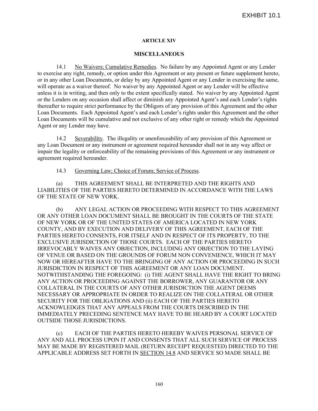 ARTICLE XIV MISCELLANEOUS 14.1 No Waivers; Cumulative Remedies. No failure by any Appointed Agent or any Lender to exercise any right, remedy, or option under this Agreement or any present or future supplement hereto, or in any other Loan Documents, or delay by any Appointed Agent or any Lender in exercising the same, will operate as a waiver thereof. No waiver by any Appointed Agent or any Lender will be effective unless it is in writing, and then only to the extent specifically stated. No waiver by any Appointed Agent or the Lenders on any occasion shall affect or diminish any Appointed Agent’s and each Lender’s rights thereafter to require strict performance by the Obligors of any provision of this Agreement and the other Loan Documents. Each Appointed Agent’s and each Lender’s rights under this Agreement and the other Loan Documents will be cumulative and not exclusive of any other right or remedy which the Appointed Agent or any Lender may have. 14.2 Severability. The illegality or unenforceability of any provision of this Agreement or any Loan Document or any instrument or agreement required hereunder shall not in any way affect or impair the legality or enforceability of the remaining provisions of this Agreement or any instrument or agreement required hereunder. 14.3 Governing Law; Choice of Forum; Service of Process. (a) THIS AGREEMENT SHALL BE INTERPRETED AND THE RIGHTS AND LIABILITIES OF THE PARTIES HERETO DETERMINED IN ACCORDANCE WITH THE LAWS OF THE STATE OF NEW YORK. (b) ANY LEGAL ACTION OR PROCEEDING WITH RESPECT TO THIS AGREEMENT OR ANY OTHER LOAN DOCUMENT SHALL BE BROUGHT IN THE COURTS OF THE STATE OF NEW YORK OR OF THE UNITED STATES OF AMERICA LOCATED IN NEW YORK COUNTY, AND BY EXECUTION AND DELIVERY OF THIS AGREEMENT, EACH OF THE PARTIES HERETO CONSENTS, FOR ITSELF AND IN RESPECT OF ITS PROPERTY, TO THE EXCLUSIVE JURISDICTION OF THOSE COURTS. EACH OF THE PARTIES HERETO IRREVOCABLY WAIVES ANY OBJECTION, INCLUDING ANY OBJECTION TO THE LAYING OF VENUE OR BASED ON THE GROUNDS OF FORUM NON CONVENIENCE, WHICH IT MAY NOW OR HEREAFTER HAVE TO THE BRINGING OF ANY ACTION OR PROCEEDING IN SUCH JURISDICTION IN RESPECT OF THIS AGREEMENT OR ANY LOAN DOCUMENT. NOTWITHSTANDING THE FOREGOING: (i) THE AGENT SHALL HAVE THE RIGHT TO BRING ANY ACTION OR PROCEEDING AGAINST THE BORROWER, ANY GUARANTOR OR ANY COLLATERAL IN THE COURTS OF ANY OTHER JURISDICTION THE AGENT DEEMS NECESSARY OR APPROPRIATE IN ORDER TO REALIZE ON THE COLLATERAL OR OTHER SECURITY FOR THE OBLIGATIONS AND (ii) EACH OF THE PARTIES HERETO ACKNOWLEDGES THAT ANY APPEALS FROM THE COURTS DESCRIBED IN THE IMMEDIATELY PRECEDING SENTENCE MAY HAVE TO BE HEARD BY A COURT LOCATED OUTSIDE THOSE JURISDICTIONS. (c) EACH OF THE PARTIES HERETO HEREBY WAIVES PERSONAL SERVICE OF ANY AND ALL PROCESS UPON IT AND CONSENTS THAT ALL SUCH SERVICE OF PROCESS MAY BE MADE BY REGISTERED MAIL (RETURN RECEIPT REQUESTED) DIRECTED TO THE APPLICABLE ADDRESS SET FORTH IN SECTION 14.8 AND SERVICE SO MADE SHALL BE 160 EXHIBIT 10.1