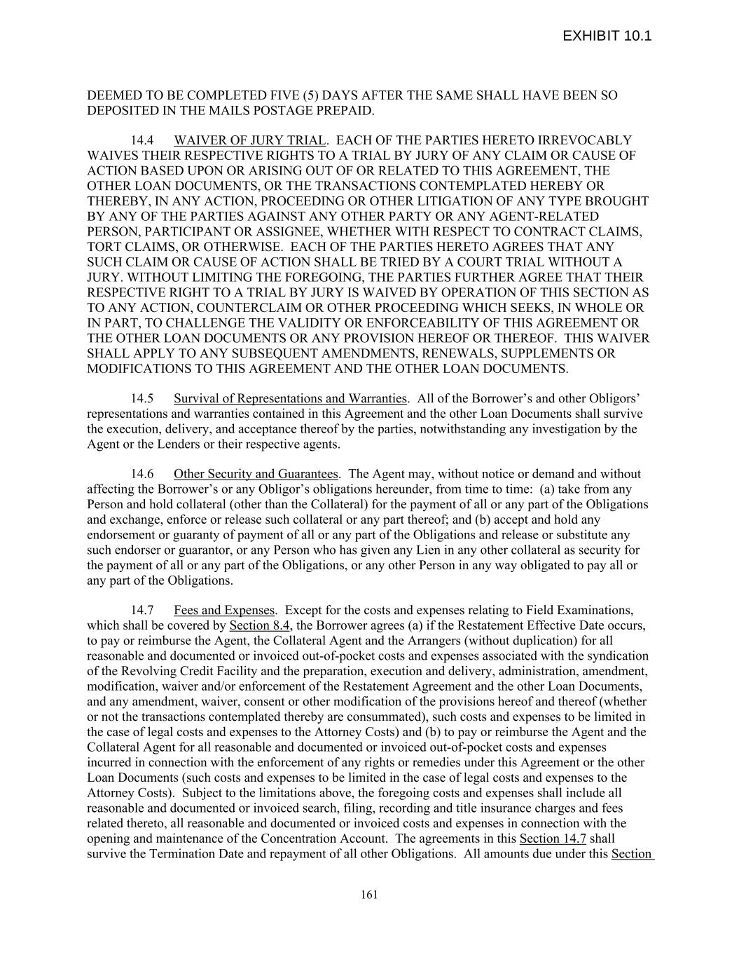 DEEMED TO BE COMPLETED FIVE (5) DAYS AFTER THE SAME SHALL HAVE BEEN SO DEPOSITED IN THE MAILS POSTAGE PREPAID. 14.4 WAIVER OF JURY TRIAL. EACH OF THE PARTIES HERETO IRREVOCABLY WAIVES THEIR RESPECTIVE RIGHTS TO A TRIAL BY JURY OF ANY CLAIM OR CAUSE OF ACTION BASED UPON OR ARISING OUT OF OR RELATED TO THIS AGREEMENT, THE OTHER LOAN DOCUMENTS, OR THE TRANSACTIONS CONTEMPLATED HEREBY OR THEREBY, IN ANY ACTION, PROCEEDING OR OTHER LITIGATION OF ANY TYPE BROUGHT BY ANY OF THE PARTIES AGAINST ANY OTHER PARTY OR ANY AGENT-RELATED PERSON, PARTICIPANT OR ASSIGNEE, WHETHER WITH RESPECT TO CONTRACT CLAIMS, TORT CLAIMS, OR OTHERWISE. EACH OF THE PARTIES HERETO AGREES THAT ANY SUCH CLAIM OR CAUSE OF ACTION SHALL BE TRIED BY A COURT TRIAL WITHOUT A JURY. WITHOUT LIMITING THE FOREGOING, THE PARTIES FURTHER AGREE THAT THEIR RESPECTIVE RIGHT TO A TRIAL BY JURY IS WAIVED BY OPERATION OF THIS SECTION AS TO ANY ACTION, COUNTERCLAIM OR OTHER PROCEEDING WHICH SEEKS, IN WHOLE OR IN PART, TO CHALLENGE THE VALIDITY OR ENFORCEABILITY OF THIS AGREEMENT OR THE OTHER LOAN DOCUMENTS OR ANY PROVISION HEREOF OR THEREOF. THIS WAIVER SHALL APPLY TO ANY SUBSEQUENT AMENDMENTS, RENEWALS, SUPPLEMENTS OR MODIFICATIONS TO THIS AGREEMENT AND THE OTHER LOAN DOCUMENTS. 14.5 Survival of Representations and Warranties. All of the Borrower’s and other Obligors’ representations and warranties contained in this Agreement and the other Loan Documents shall survive the execution, delivery, and acceptance thereof by the parties, notwithstanding any investigation by the Agent or the Lenders or their respective agents. 14.6 Other Security and Guarantees. The Agent may, without notice or demand and without affecting the Borrower’s or any Obligor’s obligations hereunder, from time to time: (a) take from any Person and hold collateral (other than the Collateral) for the payment of all or any part of the Obligations and exchange, enforce or release such collateral or any part thereof; and (b) accept and hold any endorsement or guaranty of payment of all or any part of the Obligations and release or substitute any such endorser or guarantor, or any Person who has given any Lien in any other collateral as security for the payment of all or any part of the Obligations, or any other Person in any way obligated to pay all or any part of the Obligations. 14.7 Fees and Expenses. Except for the costs and expenses relating to Field Examinations, which shall be covered by Section 8.4, the Borrower agrees (a) if the Restatement Effective Date occurs, to pay or reimburse the Agent, the Collateral Agent and the Arrangers (without duplication) for all reasonable and documented or invoiced out-of-pocket costs and expenses associated with the syndication of the Revolving Credit Facility and the preparation, execution and delivery, administration, amendment, modification, waiver and/or enforcement of the Restatement Agreement and the other Loan Documents, and any amendment, waiver, consent or other modification of the provisions hereof and thereof (whether or not the transactions contemplated thereby are consummated), such costs and expenses to be limited in the case of legal costs and expenses to the Attorney Costs) and (b) to pay or reimburse the Agent and the Collateral Agent for all reasonable and documented or invoiced out-of-pocket costs and expenses incurred in connection with the enforcement of any rights or remedies under this Agreement or the other Loan Documents (such costs and expenses to be limited in the case of legal costs and expenses to the Attorney Costs). Subject to the limitations above, the foregoing costs and expenses shall include all reasonable and documented or invoiced search, filing, recording and title insurance charges and fees related thereto, all reasonable and documented or invoiced costs and expenses in connection with the opening and maintenance of the Concentration Account. The agreements in this Section 14.7 shall survive the Termination Date and repayment of all other Obligations. All amounts due under this Section 161 EXHIBIT 10.1