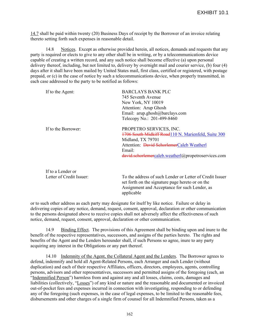 14.7 shall be paid within twenty (20) Business Days of receipt by the Borrower of an invoice relating thereto setting forth such expenses in reasonable detail. 14.8 Notices. Except as otherwise provided herein, all notices, demands and requests that any party is required or elects to give to any other shall be in writing, or by a telecommunications device capable of creating a written record, and any such notice shall become effective (a) upon personal delivery thereof, including, but not limited to, delivery by overnight mail and courier service, (b) four (4) days after it shall have been mailed by United States mail, first class, certified or registered, with postage prepaid, or (c) in the case of notice by such a telecommunications device, when properly transmitted, in each case addressed to the party to be notified as follows: If to the Agent: BARCLAYS BANK PLC 745 Seventh Avenue New York, NY 10019 Attention: Arup Ghosh Email: arup.ghosh@barclays.com Telecopy No.: 201-499-8460 If to the Borrower: PROPETRO SERVICES, INC. 1706 South Midkiff Road110 N. Marienfeld, Suite 300 Midland, TX 79701 Attention: David SchorlemerCaleb Weatherl Email: david.schorlemercaleb.weatherl@propetroservices.com If to a Lender or Letter of Credit Issuer: To the address of such Lender or Letter of Credit Issuer set forth on the signature page hereto or on the Assignment and Acceptance for such Lender, as applicable or to such other address as each party may designate for itself by like notice. Failure or delay in delivering copies of any notice, demand, request, consent, approval, declaration or other communication to the persons designated above to receive copies shall not adversely affect the effectiveness of such notice, demand, request, consent, approval, declaration or other communication. 14.9 Binding Effect. The provisions of this Agreement shall be binding upon and inure to the benefit of the respective representatives, successors, and assigns of the parties hereto. The rights and benefits of the Agent and the Lenders hereunder shall, if such Persons so agree, inure to any party acquiring any interest in the Obligations or any part thereof. 14.10 Indemnity of the Agent, the Collateral Agent and the Lenders. The Borrower agrees to defend, indemnify and hold all Agent-Related Persons, each Arranger and each Lender (without duplication) and each of their respective Affiliates, officers, directors, employees, agents, controlling persons, advisors and other representatives, successors and permitted assigns of the foregoing (each, an “Indemnified Person”) harmless from and against any and all losses, claims, costs, damages and liabilities (collectively, “Losses”) of any kind or nature and the reasonable and documented or invoiced out-of-pocket fees and expenses incurred in connection with investigating, responding to or defending any of the foregoing (such expenses, in the case of legal expenses, to be limited to the reasonable fees, disbursements and other charges of a single firm of counsel for all Indemnified Persons, taken as a 162 EXHIBIT 10.1
