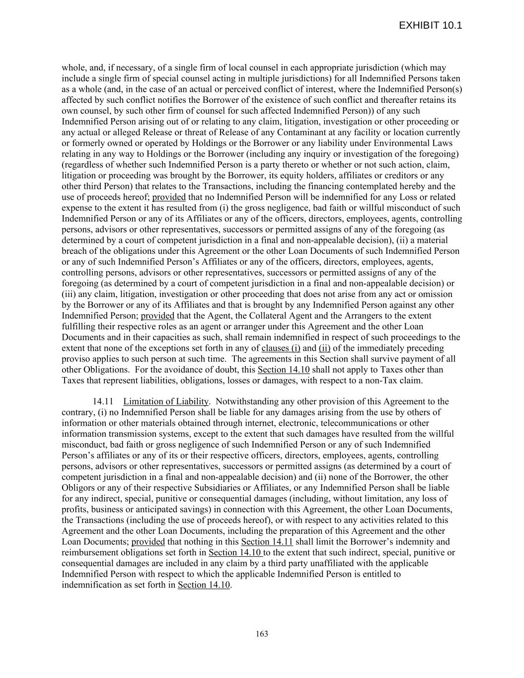 whole, and, if necessary, of a single firm of local counsel in each appropriate jurisdiction (which may include a single firm of special counsel acting in multiple jurisdictions) for all Indemnified Persons taken as a whole (and, in the case of an actual or perceived conflict of interest, where the Indemnified Person(s) affected by such conflict notifies the Borrower of the existence of such conflict and thereafter retains its own counsel, by such other firm of counsel for such affected Indemnified Person)) of any such Indemnified Person arising out of or relating to any claim, litigation, investigation or other proceeding or any actual or alleged Release or threat of Release of any Contaminant at any facility or location currently or formerly owned or operated by Holdings or the Borrower or any liability under Environmental Laws relating in any way to Holdings or the Borrower (including any inquiry or investigation of the foregoing) (regardless of whether such Indemnified Person is a party thereto or whether or not such action, claim, litigation or proceeding was brought by the Borrower, its equity holders, affiliates or creditors or any other third Person) that relates to the Transactions, including the financing contemplated hereby and the use of proceeds hereof; provided that no Indemnified Person will be indemnified for any Loss or related expense to the extent it has resulted from (i) the gross negligence, bad faith or willful misconduct of such Indemnified Person or any of its Affiliates or any of the officers, directors, employees, agents, controlling persons, advisors or other representatives, successors or permitted assigns of any of the foregoing (as determined by a court of competent jurisdiction in a final and non-appealable decision), (ii) a material breach of the obligations under this Agreement or the other Loan Documents of such Indemnified Person or any of such Indemnified Person’s Affiliates or any of the officers, directors, employees, agents, controlling persons, advisors or other representatives, successors or permitted assigns of any of the foregoing (as determined by a court of competent jurisdiction in a final and non-appealable decision) or (iii) any claim, litigation, investigation or other proceeding that does not arise from any act or omission by the Borrower or any of its Affiliates and that is brought by any Indemnified Person against any other Indemnified Person; provided that the Agent, the Collateral Agent and the Arrangers to the extent fulfilling their respective roles as an agent or arranger under this Agreement and the other Loan Documents and in their capacities as such, shall remain indemnified in respect of such proceedings to the extent that none of the exceptions set forth in any of clauses (i) and (ii) of the immediately preceding proviso applies to such person at such time. The agreements in this Section shall survive payment of all other Obligations. For the avoidance of doubt, this Section 14.10 shall not apply to Taxes other than Taxes that represent liabilities, obligations, losses or damages, with respect to a non-Tax claim. 14.11 Limitation of Liability. Notwithstanding any other provision of this Agreement to the contrary, (i) no Indemnified Person shall be liable for any damages arising from the use by others of information or other materials obtained through internet, electronic, telecommunications or other information transmission systems, except to the extent that such damages have resulted from the willful misconduct, bad faith or gross negligence of such Indemnified Person or any of such Indemnified Person’s affiliates or any of its or their respective officers, directors, employees, agents, controlling persons, advisors or other representatives, successors or permitted assigns (as determined by a court of competent jurisdiction in a final and non-appealable decision) and (ii) none of the Borrower, the other Obligors or any of their respective Subsidiaries or Affiliates, or any Indemnified Person shall be liable for any indirect, special, punitive or consequential damages (including, without limitation, any loss of profits, business or anticipated savings) in connection with this Agreement, the other Loan Documents, the Transactions (including the use of proceeds hereof), or with respect to any activities related to this Agreement and the other Loan Documents, including the preparation of this Agreement and the other Loan Documents; provided that nothing in this Section 14.11 shall limit the Borrower’s indemnity and reimbursement obligations set forth in Section 14.10 to the extent that such indirect, special, punitive or consequential damages are included in any claim by a third party unaffiliated with the applicable Indemnified Person with respect to which the applicable Indemnified Person is entitled to indemnification as set forth in Section 14.10. 163 EXHIBIT 10.1