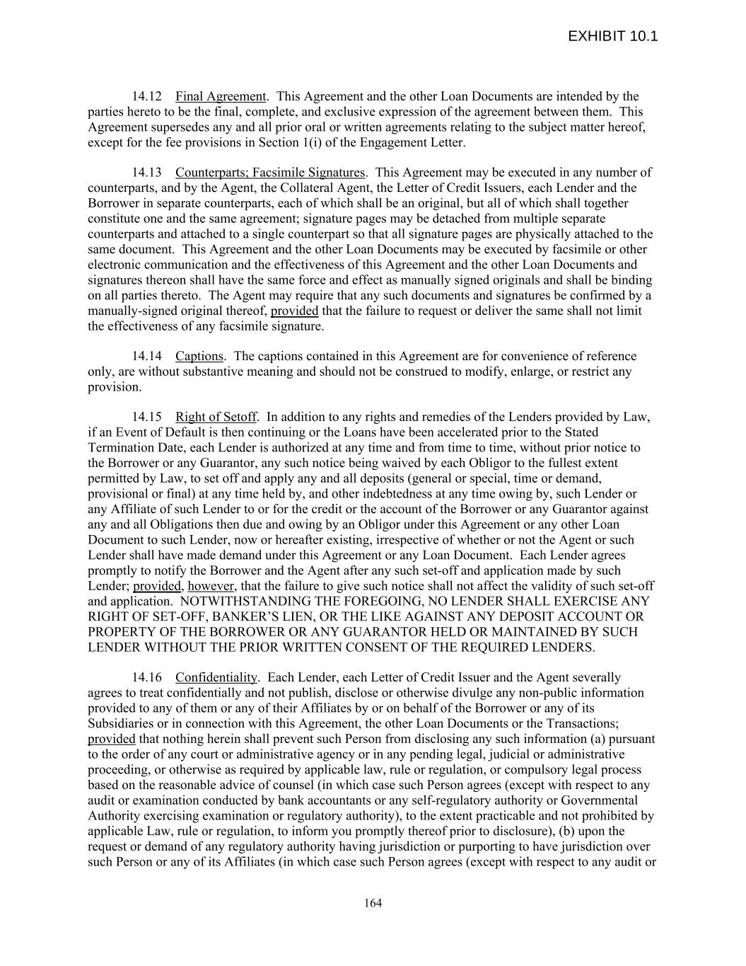14.12 Final Agreement. This Agreement and the other Loan Documents are intended by the parties hereto to be the final, complete, and exclusive expression of the agreement between them. This Agreement supersedes any and all prior oral or written agreements relating to the subject matter hereof, except for the fee provisions in Section 1(i) of the Engagement Letter. 14.13 Counterparts; Facsimile Signatures. This Agreement may be executed in any number of counterparts, and by the Agent, the Collateral Agent, the Letter of Credit Issuers, each Lender and the Borrower in separate counterparts, each of which shall be an original, but all of which shall together constitute one and the same agreement; signature pages may be detached from multiple separate counterparts and attached to a single counterpart so that all signature pages are physically attached to the same document. This Agreement and the other Loan Documents may be executed by facsimile or other electronic communication and the effectiveness of this Agreement and the other Loan Documents and signatures thereon shall have the same force and effect as manually signed originals and shall be binding on all parties thereto. The Agent may require that any such documents and signatures be confirmed by a manually-signed original thereof, provided that the failure to request or deliver the same shall not limit the effectiveness of any facsimile signature. 14.14 Captions. The captions contained in this Agreement are for convenience of reference only, are without substantive meaning and should not be construed to modify, enlarge, or restrict any provision. 14.15 Right of Setoff. In addition to any rights and remedies of the Lenders provided by Law, if an Event of Default is then continuing or the Loans have been accelerated prior to the Stated Termination Date, each Lender is authorized at any time and from time to time, without prior notice to the Borrower or any Guarantor, any such notice being waived by each Obligor to the fullest extent permitted by Law, to set off and apply any and all deposits (general or special, time or demand, provisional or final) at any time held by, and other indebtedness at any time owing by, such Lender or any Affiliate of such Lender to or for the credit or the account of the Borrower or any Guarantor against any and all Obligations then due and owing by an Obligor under this Agreement or any other Loan Document to such Lender, now or hereafter existing, irrespective of whether or not the Agent or such Lender shall have made demand under this Agreement or any Loan Document. Each Lender agrees promptly to notify the Borrower and the Agent after any such set-off and application made by such Lender; provided, however, that the failure to give such notice shall not affect the validity of such set-off and application. NOTWITHSTANDING THE FOREGOING, NO LENDER SHALL EXERCISE ANY RIGHT OF SET-OFF, BANKER’S LIEN, OR THE LIKE AGAINST ANY DEPOSIT ACCOUNT OR PROPERTY OF THE BORROWER OR ANY GUARANTOR HELD OR MAINTAINED BY SUCH LENDER WITHOUT THE PRIOR WRITTEN CONSENT OF THE REQUIRED LENDERS. 14.16 Confidentiality. Each Lender, each Letter of Credit Issuer and the Agent severally agrees to treat confidentially and not publish, disclose or otherwise divulge any non-public information provided to any of them or any of their Affiliates by or on behalf of the Borrower or any of its Subsidiaries or in connection with this Agreement, the other Loan Documents or the Transactions; provided that nothing herein shall prevent such Person from disclosing any such information (a) pursuant to the order of any court or administrative agency or in any pending legal, judicial or administrative proceeding, or otherwise as required by applicable law, rule or regulation, or compulsory legal process based on the reasonable advice of counsel (in which case such Person agrees (except with respect to any audit or examination conducted by bank accountants or any self-regulatory authority or Governmental Authority exercising examination or regulatory authority), to the extent practicable and not prohibited by applicable Law, rule or regulation, to inform you promptly thereof prior to disclosure), (b) upon the request or demand of any regulatory authority having jurisdiction or purporting to have jurisdiction over such Person or any of its Affiliates (in which case such Person agrees (except with respect to any audit or 164 EXHIBIT 10.1