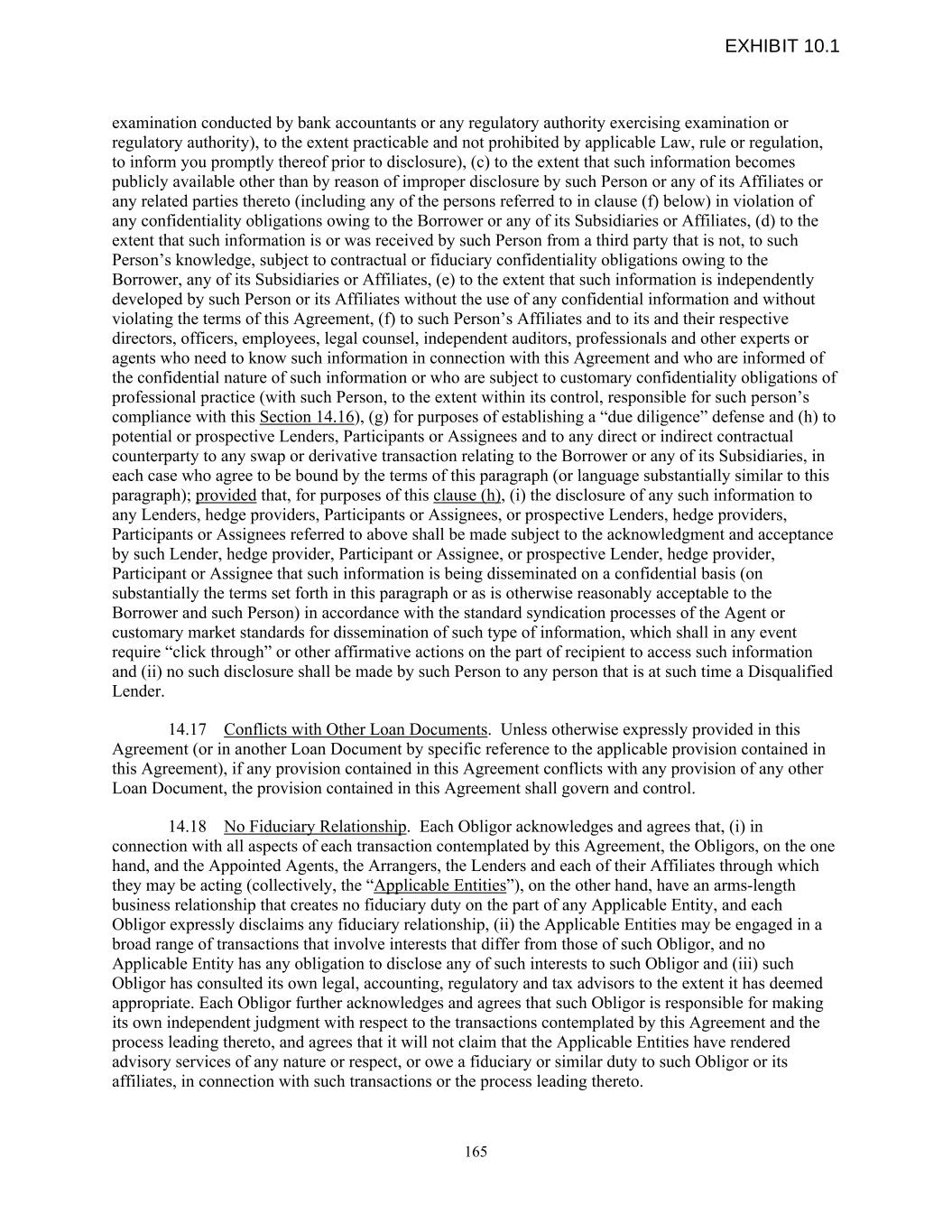 examination conducted by bank accountants or any regulatory authority exercising examination or regulatory authority), to the extent practicable and not prohibited by applicable Law, rule or regulation, to inform you promptly thereof prior to disclosure), (c) to the extent that such information becomes publicly available other than by reason of improper disclosure by such Person or any of its Affiliates or any related parties thereto (including any of the persons referred to in clause (f) below) in violation of any confidentiality obligations owing to the Borrower or any of its Subsidiaries or Affiliates, (d) to the extent that such information is or was received by such Person from a third party that is not, to such Person’s knowledge, subject to contractual or fiduciary confidentiality obligations owing to the Borrower, any of its Subsidiaries or Affiliates, (e) to the extent that such information is independently developed by such Person or its Affiliates without the use of any confidential information and without violating the terms of this Agreement, (f) to such Person’s Affiliates and to its and their respective directors, officers, employees, legal counsel, independent auditors, professionals and other experts or agents who need to know such information in connection with this Agreement and who are informed of the confidential nature of such information or who are subject to customary confidentiality obligations of professional practice (with such Person, to the extent within its control, responsible for such person’s compliance with this Section 14.16), (g) for purposes of establishing a “due diligence” defense and (h) to potential or prospective Lenders, Participants or Assignees and to any direct or indirect contractual counterparty to any swap or derivative transaction relating to the Borrower or any of its Subsidiaries, in each case who agree to be bound by the terms of this paragraph (or language substantially similar to this paragraph); provided that, for purposes of this clause (h), (i) the disclosure of any such information to any Lenders, hedge providers, Participants or Assignees, or prospective Lenders, hedge providers, Participants or Assignees referred to above shall be made subject to the acknowledgment and acceptance by such Lender, hedge provider, Participant or Assignee, or prospective Lender, hedge provider, Participant or Assignee that such information is being disseminated on a confidential basis (on substantially the terms set forth in this paragraph or as is otherwise reasonably acceptable to the Borrower and such Person) in accordance with the standard syndication processes of the Agent or customary market standards for dissemination of such type of information, which shall in any event require “click through” or other affirmative actions on the part of recipient to access such information and (ii) no such disclosure shall be made by such Person to any person that is at such time a Disqualified Lender. 14.17 Conflicts with Other Loan Documents. Unless otherwise expressly provided in this Agreement (or in another Loan Document by specific reference to the applicable provision contained in this Agreement), if any provision contained in this Agreement conflicts with any provision of any other Loan Document, the provision contained in this Agreement shall govern and control. 14.18 No Fiduciary Relationship. Each Obligor acknowledges and agrees that, (i) in connection with all aspects of each transaction contemplated by this Agreement, the Obligors, on the one hand, and the Appointed Agents, the Arrangers, the Lenders and each of their Affiliates through which they may be acting (collectively, the “Applicable Entities”), on the other hand, have an arms-length business relationship that creates no fiduciary duty on the part of any Applicable Entity, and each Obligor expressly disclaims any fiduciary relationship, (ii) the Applicable Entities may be engaged in a broad range of transactions that involve interests that differ from those of such Obligor, and no Applicable Entity has any obligation to disclose any of such interests to such Obligor and (iii) such Obligor has consulted its own legal, accounting, regulatory and tax advisors to the extent it has deemed appropriate. Each Obligor further acknowledges and agrees that such Obligor is responsible for making its own independent judgment with respect to the transactions contemplated by this Agreement and the process leading thereto, and agrees that it will not claim that the Applicable Entities have rendered advisory services of any nature or respect, or owe a fiduciary or similar duty to such Obligor or its affiliates, in connection with such transactions or the process leading thereto. 165 EXHIBIT 10.1