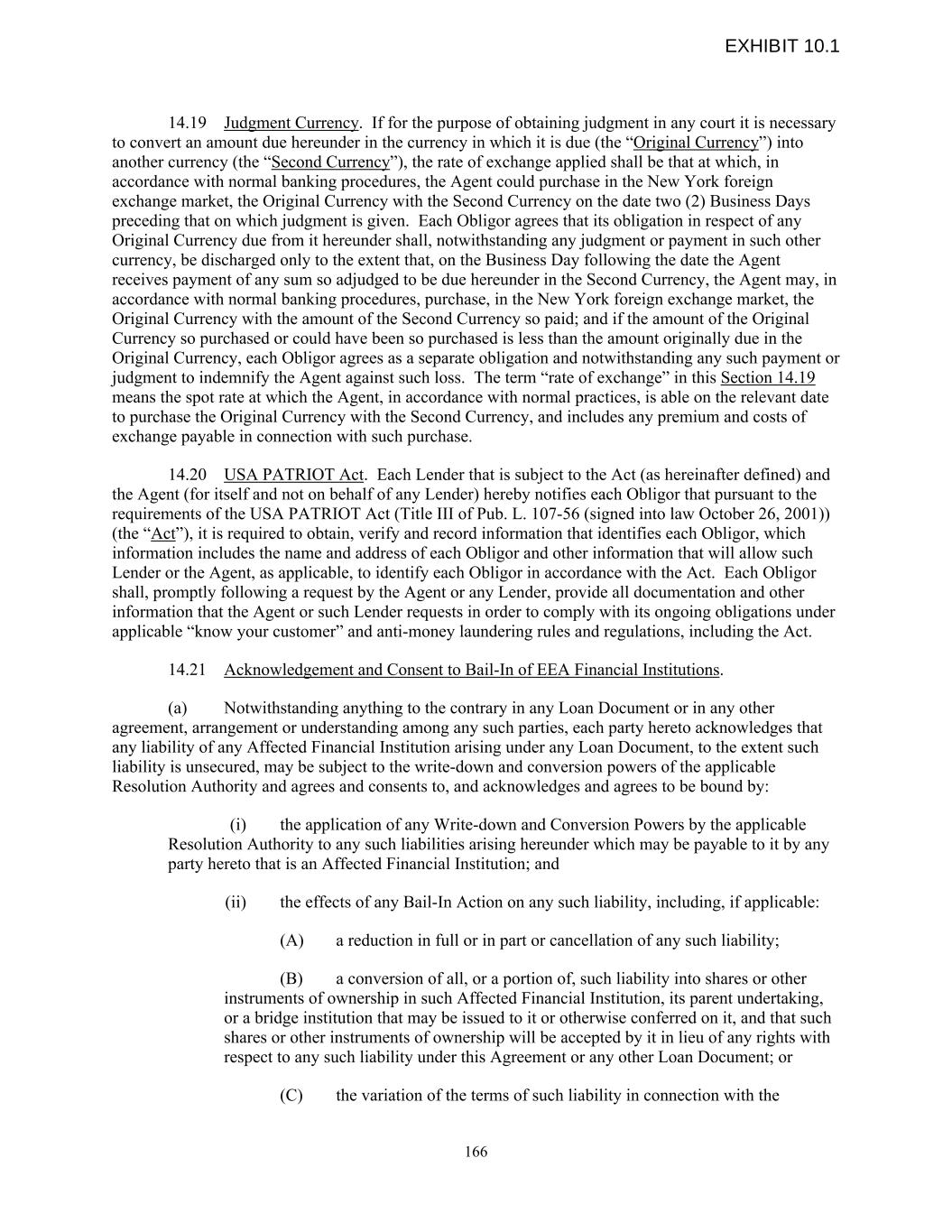 14.19 Judgment Currency. If for the purpose of obtaining judgment in any court it is necessary to convert an amount due hereunder in the currency in which it is due (the “Original Currency”) into another currency (the “Second Currency”), the rate of exchange applied shall be that at which, in accordance with normal banking procedures, the Agent could purchase in the New York foreign exchange market, the Original Currency with the Second Currency on the date two (2) Business Days preceding that on which judgment is given. Each Obligor agrees that its obligation in respect of any Original Currency due from it hereunder shall, notwithstanding any judgment or payment in such other currency, be discharged only to the extent that, on the Business Day following the date the Agent receives payment of any sum so adjudged to be due hereunder in the Second Currency, the Agent may, in accordance with normal banking procedures, purchase, in the New York foreign exchange market, the Original Currency with the amount of the Second Currency so paid; and if the amount of the Original Currency so purchased or could have been so purchased is less than the amount originally due in the Original Currency, each Obligor agrees as a separate obligation and notwithstanding any such payment or judgment to indemnify the Agent against such loss. The term “rate of exchange” in this Section 14.19 means the spot rate at which the Agent, in accordance with normal practices, is able on the relevant date to purchase the Original Currency with the Second Currency, and includes any premium and costs of exchange payable in connection with such purchase. 14.20 USA PATRIOT Act. Each Lender that is subject to the Act (as hereinafter defined) and the Agent (for itself and not on behalf of any Lender) hereby notifies each Obligor that pursuant to the requirements of the USA PATRIOT Act (Title III of Pub. L. 107-56 (signed into law October 26, 2001)) (the “Act”), it is required to obtain, verify and record information that identifies each Obligor, which information includes the name and address of each Obligor and other information that will allow such Lender or the Agent, as applicable, to identify each Obligor in accordance with the Act. Each Obligor shall, promptly following a request by the Agent or any Lender, provide all documentation and other information that the Agent or such Lender requests in order to comply with its ongoing obligations under applicable “know your customer” and anti-money laundering rules and regulations, including the Act. 14.21 Acknowledgement and Consent to Bail-In of EEA Financial Institutions. (a) Notwithstanding anything to the contrary in any Loan Document or in any other agreement, arrangement or understanding among any such parties, each party hereto acknowledges that any liability of any Affected Financial Institution arising under any Loan Document, to the extent such liability is unsecured, may be subject to the write-down and conversion powers of the applicable Resolution Authority and agrees and consents to, and acknowledges and agrees to be bound by: (i) the application of any Write-down and Conversion Powers by the applicable Resolution Authority to any such liabilities arising hereunder which may be payable to it by any party hereto that is an Affected Financial Institution; and (ii) the effects of any Bail-In Action on any such liability, including, if applicable: (A) a reduction in full or in part or cancellation of any such liability; (B) a conversion of all, or a portion of, such liability into shares or other instruments of ownership in such Affected Financial Institution, its parent undertaking, or a bridge institution that may be issued to it or otherwise conferred on it, and that such shares or other instruments of ownership will be accepted by it in lieu of any rights with respect to any such liability under this Agreement or any other Loan Document; or (C) the variation of the terms of such liability in connection with the 166 EXHIBIT 10.1