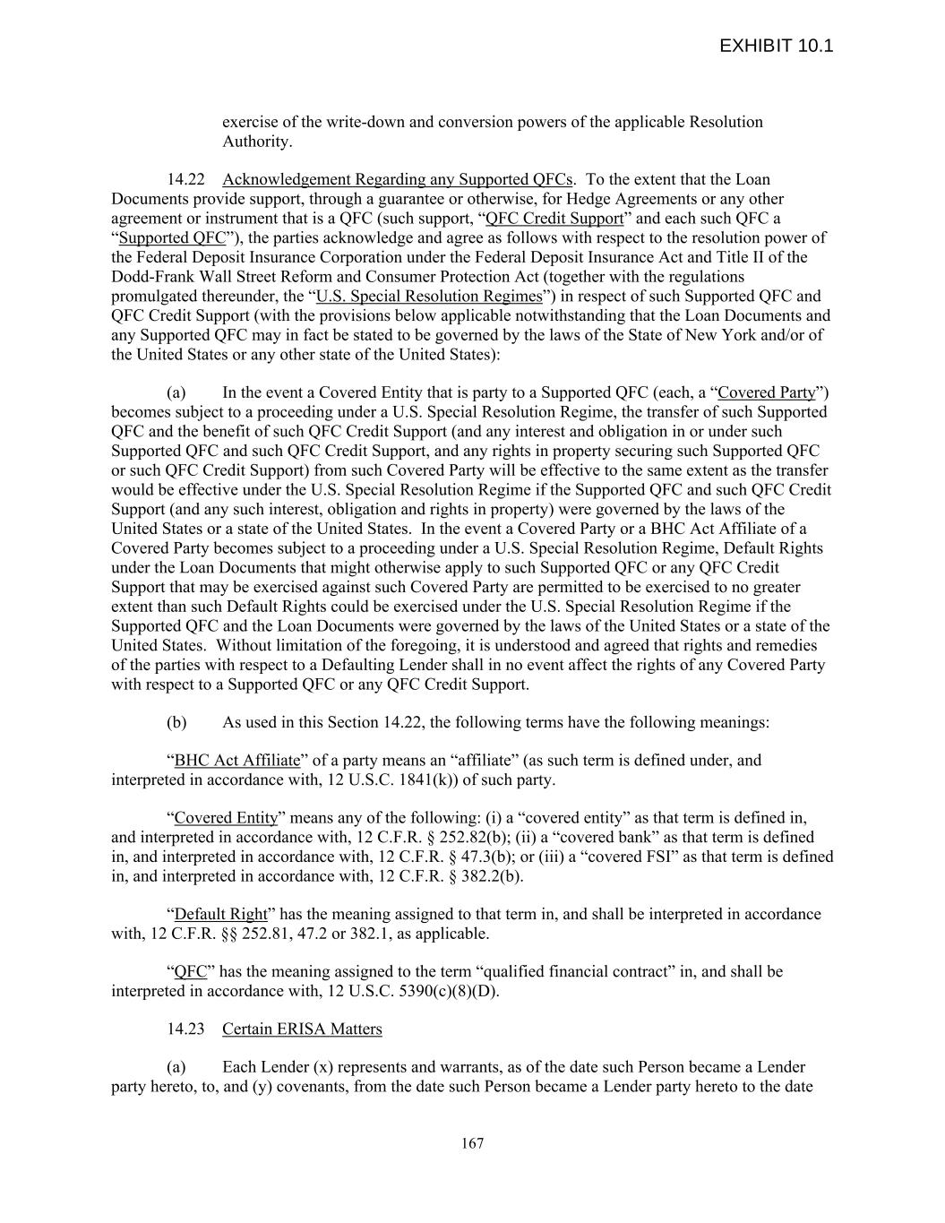 exercise of the write-down and conversion powers of the applicable Resolution Authority. 14.22 Acknowledgement Regarding any Supported QFCs. To the extent that the Loan Documents provide support, through a guarantee or otherwise, for Hedge Agreements or any other agreement or instrument that is a QFC (such support, “QFC Credit Support” and each such QFC a “Supported QFC”), the parties acknowledge and agree as follows with respect to the resolution power of the Federal Deposit Insurance Corporation under the Federal Deposit Insurance Act and Title II of the Dodd-Frank Wall Street Reform and Consumer Protection Act (together with the regulations promulgated thereunder, the “U.S. Special Resolution Regimes”) in respect of such Supported QFC and QFC Credit Support (with the provisions below applicable notwithstanding that the Loan Documents and any Supported QFC may in fact be stated to be governed by the laws of the State of New York and/or of the United States or any other state of the United States): (a) In the event a Covered Entity that is party to a Supported QFC (each, a “Covered Party”) becomes subject to a proceeding under a U.S. Special Resolution Regime, the transfer of such Supported QFC and the benefit of such QFC Credit Support (and any interest and obligation in or under such Supported QFC and such QFC Credit Support, and any rights in property securing such Supported QFC or such QFC Credit Support) from such Covered Party will be effective to the same extent as the transfer would be effective under the U.S. Special Resolution Regime if the Supported QFC and such QFC Credit Support (and any such interest, obligation and rights in property) were governed by the laws of the United States or a state of the United States. In the event a Covered Party or a BHC Act Affiliate of a Covered Party becomes subject to a proceeding under a U.S. Special Resolution Regime, Default Rights under the Loan Documents that might otherwise apply to such Supported QFC or any QFC Credit Support that may be exercised against such Covered Party are permitted to be exercised to no greater extent than such Default Rights could be exercised under the U.S. Special Resolution Regime if the Supported QFC and the Loan Documents were governed by the laws of the United States or a state of the United States. Without limitation of the foregoing, it is understood and agreed that rights and remedies of the parties with respect to a Defaulting Lender shall in no event affect the rights of any Covered Party with respect to a Supported QFC or any QFC Credit Support. (b) As used in this Section 14.22, the following terms have the following meanings: “BHC Act Affiliate” of a party means an “affiliate” (as such term is defined under, and interpreted in accordance with, 12 U.S.C. 1841(k)) of such party. “Covered Entity” means any of the following: (i) a “covered entity” as that term is defined in, and interpreted in accordance with, 12 C.F.R. § 252.82(b); (ii) a “covered bank” as that term is defined in, and interpreted in accordance with, 12 C.F.R. § 47.3(b); or (iii) a “covered FSI” as that term is defined in, and interpreted in accordance with, 12 C.F.R. § 382.2(b). “Default Right” has the meaning assigned to that term in, and shall be interpreted in accordance with, 12 C.F.R. §§ 252.81, 47.2 or 382.1, as applicable. “QFC” has the meaning assigned to the term “qualified financial contract” in, and shall be interpreted in accordance with, 12 U.S.C. 5390(c)(8)(D). 14.23 Certain ERISA Matters (a) Each Lender (x) represents and warrants, as of the date such Person became a Lender party hereto, to, and (y) covenants, from the date such Person became a Lender party hereto to the date 167 EXHIBIT 10.1