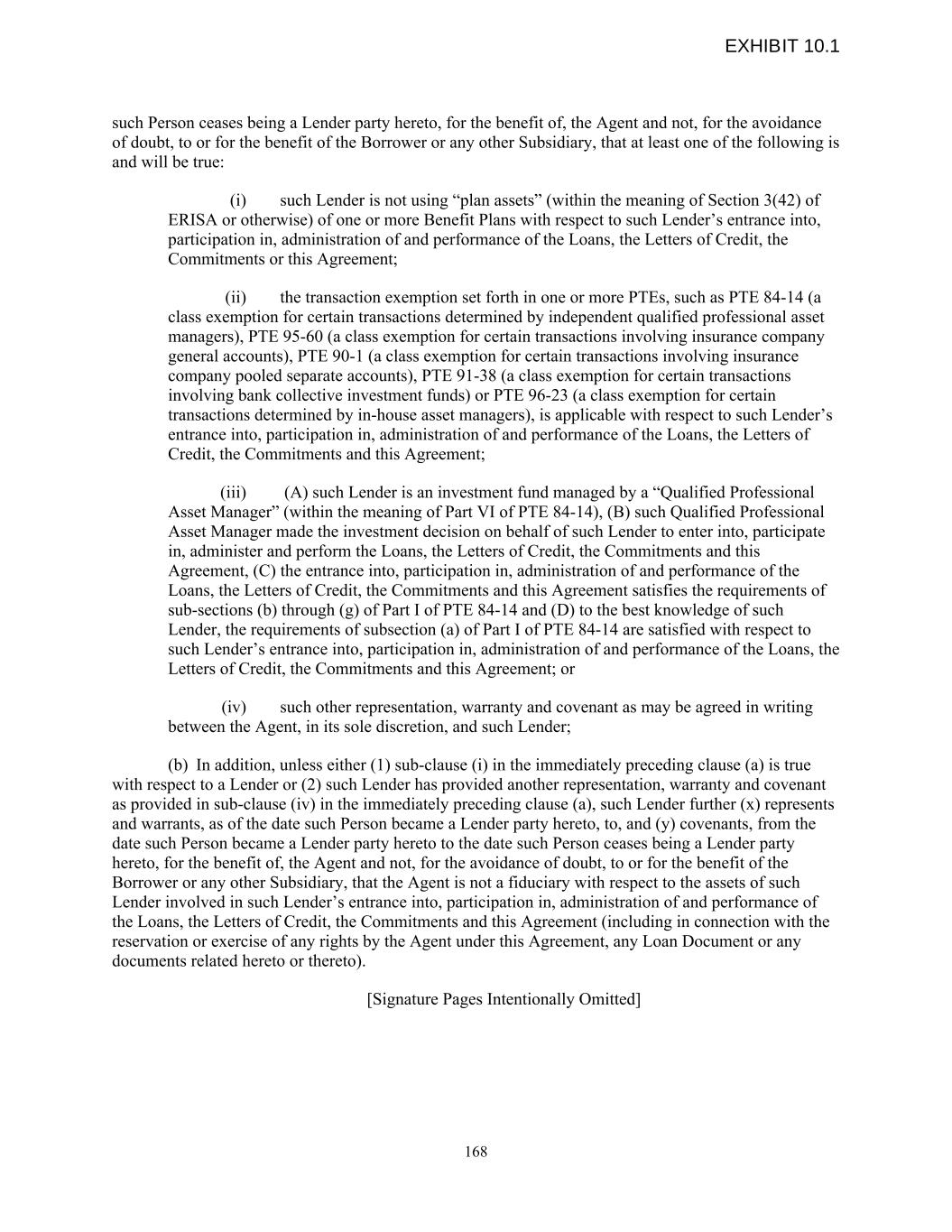 such Person ceases being a Lender party hereto, for the benefit of, the Agent and not, for the avoidance of doubt, to or for the benefit of the Borrower or any other Subsidiary, that at least one of the following is and will be true: (i) such Lender is not using “plan assets” (within the meaning of Section 3(42) of ERISA or otherwise) of one or more Benefit Plans with respect to such Lender’s entrance into, participation in, administration of and performance of the Loans, the Letters of Credit, the Commitments or this Agreement; (ii) the transaction exemption set forth in one or more PTEs, such as PTE 84-14 (a class exemption for certain transactions determined by independent qualified professional asset managers), PTE 95-60 (a class exemption for certain transactions involving insurance company general accounts), PTE 90-1 (a class exemption for certain transactions involving insurance company pooled separate accounts), PTE 91-38 (a class exemption for certain transactions involving bank collective investment funds) or PTE 96-23 (a class exemption for certain transactions determined by in-house asset managers), is applicable with respect to such Lender’s entrance into, participation in, administration of and performance of the Loans, the Letters of Credit, the Commitments and this Agreement; (iii) (A) such Lender is an investment fund managed by a “Qualified Professional Asset Manager” (within the meaning of Part VI of PTE 84-14), (B) such Qualified Professional Asset Manager made the investment decision on behalf of such Lender to enter into, participate in, administer and perform the Loans, the Letters of Credit, the Commitments and this Agreement, (C) the entrance into, participation in, administration of and performance of the Loans, the Letters of Credit, the Commitments and this Agreement satisfies the requirements of sub-sections (b) through (g) of Part I of PTE 84-14 and (D) to the best knowledge of such Lender, the requirements of subsection (a) of Part I of PTE 84-14 are satisfied with respect to such Lender’s entrance into, participation in, administration of and performance of the Loans, the Letters of Credit, the Commitments and this Agreement; or (iv) such other representation, warranty and covenant as may be agreed in writing between the Agent, in its sole discretion, and such Lender; (b) In addition, unless either (1) sub-clause (i) in the immediately preceding clause (a) is true with respect to a Lender or (2) such Lender has provided another representation, warranty and covenant as provided in sub-clause (iv) in the immediately preceding clause (a), such Lender further (x) represents and warrants, as of the date such Person became a Lender party hereto, to, and (y) covenants, from the date such Person became a Lender party hereto to the date such Person ceases being a Lender party hereto, for the benefit of, the Agent and not, for the avoidance of doubt, to or for the benefit of the Borrower or any other Subsidiary, that the Agent is not a fiduciary with respect to the assets of such Lender involved in such Lender’s entrance into, participation in, administration of and performance of the Loans, the Letters of Credit, the Commitments and this Agreement (including in connection with the reservation or exercise of any rights by the Agent under this Agreement, any Loan Document or any documents related hereto or thereto). [Signature Pages Intentionally Omitted] 168 EXHIBIT 10.1
