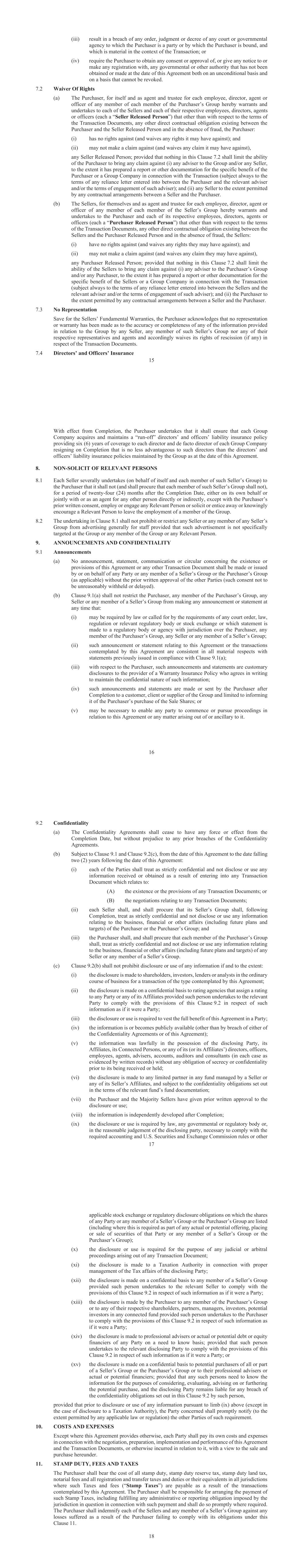 15 (iii) result in a breach of any order, judgment or decree of any court or governmental agency to which the Purchaser is a party or by which the Purchaser is bound, and which is material in the context of the Transaction; or (iv) require the Purchaser to obtain any consent or approval of, or give any notice to or make any registration with, any governmental or other authority that has not been obtained or made at the date of this Agreement both on an unconditional basis and on a basis that cannot be revoked. 7.2 Waiver Of Rights (a) The Purchaser, for itself and as agent and trustee for each employee, director, agent or officer of any member of each member of the Purchaser’s Group hereby warrants and undertakes to each of the Sellers and each of their respective employees, directors, agents or officers (each a “Seller Released Person”) that other than with respect to the terms of the Transaction Documents, any other direct contractual obligation existing between the Purchaser and the Seller Released Person and in the absence of fraud, the Purchaser: (i) has no rights against (and waives any rights it may have against); and (ii) may not make a claim against (and waives any claim it may have against), any Seller Released Person; provided that nothing in this Clause 7.2 shall limit the ability of the Purchaser to bring any claim against (i) any adviser to the Group and/or any Seller, to the extent it has prepared a report or other documentation for the specific benefit of the Purchaser or a Group Company in connection with the Transaction (subject always to the terms of any reliance letter entered into between the Purchaser and the relevant adviser and/or the terms of engagement of such adviser); and (ii) any Seller to the extent permitted by any contractual arrangements between a Seller and the Purchaser. (b) The Sellers, for themselves and as agent and trustee for each employee, director, agent or officer of any member of each member of the Seller’s Group hereby warrants and undertakes to the Purchaser and each of its respective employees, directors, agents or officers (each a “Purchaser Released Person”) that other than with respect to the terms of the Transaction Documents, any other direct contractual obligation existing between the Sellers and the Purchaser Released Person and in the absence of fraud, the Sellers: (i) have no rights against (and waives any rights they may have against); and (ii) may not make a claim against (and waives any claim they may have against), any Purchaser Released Person; provided that nothing in this Clause 7.2 shall limit the ability of the Sellers to bring any claim against (i) any adviser to the Purchaser’s Group and/or any Purchaser, to the extent it has prepared a report or other documentation for the specific benefit of the Sellers or a Group Company in connection with the Transaction (subject always to the terms of any reliance letter entered into between the Sellers and the relevant adviser and/or the terms of engagement of such adviser); and (ii) the Purchaser to the extent permitted by any contractual arrangements between a Seller and the Purchaser. 7.3 No Representation Save for the Sellers’ Fundamental Warranties, the Purchaser acknowledges that no representation or warranty has been made as to the accuracy or completeness of any of the information provided in relation to the Group by any Seller, any member of such Seller’s Group nor any of their respective representatives and agents and accordingly waives its rights of rescission (if any) in respect of the Transaction Documents. 7.4 Directors’ and Officers’ Insurance 16 With effect from Completion, the Purchaser undertakes that it shall ensure that each Group Company acquires and maintains a “run-off” directors’ and officers’ liability insurance policy providing six (6) years of coverage to each director and de facto director of each Group Company resigning on Completion that is no less advantageous to such directors than the directors’ and officers’ liability insurance policies maintained by the Group as at the date of this Agreement. 8. NON-SOLICIT OF RELEVANT PERSONS 8.1 Each Seller severally undertakes (on behalf of itself and each member of such Seller’s Group) to the Purchaser that it shall not (and shall procure that each member of such Seller’s Group shall not), for a period of twenty-four (24) months after the Completion Date, either on its own behalf or jointly with or as an agent for any other person directly or indirectly, except with the Purchaser’s prior written consent, employ or engage any Relevant Person or solicit or entice away or knowingly encourage a Relevant Person to leave the employment of a member of the Group. 8.2 The undertaking in Clause 8.1 shall not prohibit or restrict any Seller or any member of any Seller’s Group from advertising generally for staff provided that such advertisement is not specifically targeted at the Group or any member of the Group or any Relevant Person. 9. ANNOUNCEMENTS AND CONFIDENTIALITY 9.1 Announcements (a) No announcement, statement, communication or circular concerning the existence or provisions of this Agreement or any other Transaction Document shall be made or issued by or on behalf of any Party or any member of a Seller’s Group or the Purchaser’s Group (as applicable) without the prior written approval of the other Parties (such consent not to be unreasonably withheld or delayed). (b) Clause 9.1(a) shall not restrict the Purchaser, any member of the Purchaser’s Group, any Seller or any member of a Seller’s Group from making any announcement or statement at any time that: (i) may be required by law or called for by the requirements of any court order, law, regulation or relevant regulatory body or stock exchange or which statement is made to a regulatory body or agency with jurisdiction over the Purchaser, any member of the Purchaser’s Group, any Seller or any member of a Seller