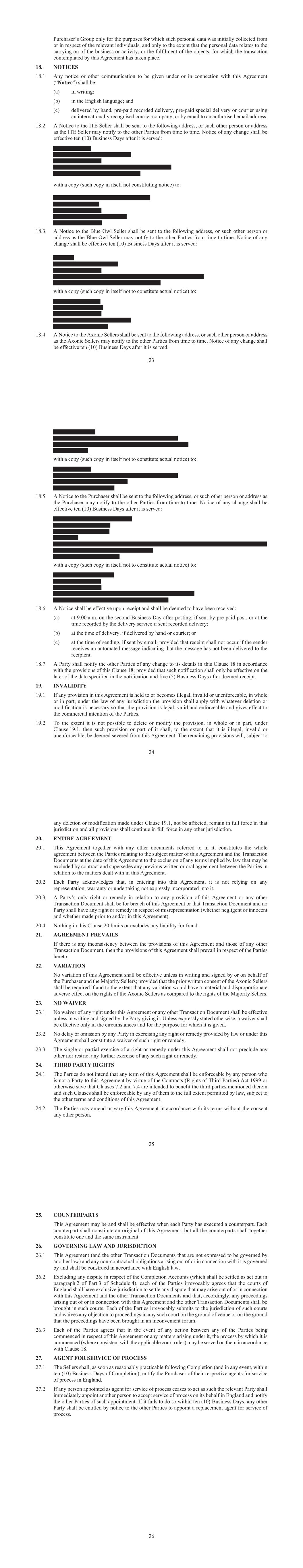 23 Purchaser’s Group only for the purposes for which such personal data was initially collected from or in respect of the relevant individuals, and only to the extent that the personal data relates to the carrying on of the business or activity, or the fulfilment of the objects, for which the transaction contemplated by this Agreement has taken place. 18. NOTICES 18.1 Any notice or other communication to be given under or in connection with this Agreement (“Notice”) shall be: (a) in writing; (b) in the English language; and (c) delivered by hand, pre-paid recorded delivery, pre-paid special delivery or courier using an internationally recognised courier company, or by email to an authorised email address. 18.2 A Notice to the ITE Seller shall be sent to the following address, or such other person or address as the ITE Seller may notify to the other Parties from time to time. Notice of any change shall be effective ten (10) Business Days after it is served: with a copy (such copy in itself not constituting notice) to: 18.3 A Notice to the Blue Owl Seller shall be sent to the following address, or such other person or address as the Blue Owl Seller may notify to the other Parties from time to time. Notice of any change shall be effective ten (10) Business Days after it is served: with a copy (such copy in itself not to constitute actual notice) to: 18.4 A Notice to the Axonic Sellers shall be sent to the following address, or such other person or address as the Axonic Sellers may notify to the other Parties from time to time. Notice of any change shall be effective ten (10) Business Days after it is served: 24 with a copy (such copy in itself not to constitute actual notice) to: 18.5 A Notice to the Purchaser shall be sent to the following address, or such other person or address as the Purchaser may notify to the other Parties from time to time. Notice of any change shall be effective ten (10) Business Days after it is served: with a copy (such copy in itself not to constitute actual notice) to: 18.6 A Notice shall be effective upon receipt and shall be deemed to have been received: (a) at 9.00 a.m. on the second Business Day after posting, if sent by pre-paid post, or at the time recorded by the delivery service if sent recorded delivery; (b) at the time of delivery, if delivered by hand or courier; or (c) at the time of sending, if sent by email; provided that receipt shall not occur if the sender receives an automated message indicating that the message has not been delivered to the recipient. 18.7 A Party shall notify the other Parties of any change to its details in this Clause 18 in accordance with the provisions of this Clause 18; provided that such notification shall only be effective on the later of the date specified in the notification and five (5) Business Days after deemed receipt. 19. INVALIDITY 19.1 If any provision in this Agreement is held to or becomes illegal, invalid or unenforceable, in whole or in part, under the law of any jurisdiction the provision shall apply with whatever deletion or modification is necessary so that the provision is legal, valid and enforceable and gives effect to the commercial intention of the Parties. 19.2 To the extent it is not possible to delete or modify the provision, in whole or in part, under Clause 19.1, then such provision or part of it shall, to the extent that it is illegal, invalid or unenforceable, be deemed severed from this Agreement. The remaining provisions will, subject to 25 any deletion or modification made under Clause 19.1, not be affected, remain in full force in that jurisdiction and all provisions shall continue in full force in any other jurisdiction. 20. ENTIRE AGREEMENT 20.1 This Agreement together with any other documents referred to in it, constitutes the whole agreement between the Parties relating to the subject matter of this Agreement and the Transaction Documents at the date of this Agreement to the exclusion of any terms implied by law that may be excluded by contract and supersedes any previous written or oral agreement between the Parties in relation to the matters dealt with in this Agreement. 20.2 Each Party acknowledges that, in entering into this Agreement, it is not relying on any representation, warranty or undertaking not expressly incorporated into it. 20.3 A Party’s only right or remedy in relation to any provision of this Agreement or any other Transaction Document shall be for breach of this Agreement or that Transaction Document and no Party shall have any right or remedy in respect of misrepresentation (whether negligent or innocent and whether made prior to and/or in this Agreement). 20.4 Nothing in this Clause 20 limits or excludes any liability for fraud. 21. AGREEMENT PREVAILS If there is any inconsistency between the provisions of this Agreement and those of any other Transaction Document, then the provisions of this Agreement shall prevail in respect of the Parties hereto. 22. VARIATION No variation of this Agreement shall be effective unless in writing and signed by or on behalf of the Purchaser and the Majority Sellers; provided that the prior written consent of the Axonic Sellers shall be required if and to the extent that any variation would have a material and disproportionate adverse effect on the rights of the Axonic Sellers as compared to the rights of the Majority Sellers. 23. NO WAIVER 23.1 No waiver of any right under this Agreement or any other Transaction Document shall be effective unless in writing and signed by the Party giving it. Unless expressly stated otherwise, a waiver shall be effective only in the circumstances and for the purpose for which it is given. 23.2 No delay or omission by any Party in exercising any right or remedy provided by law or under this Agreement shall constitute a waiver of such right or remedy. 23.3 The single or partial exercise of a right or remedy under this Agreement shall not preclude any other nor restrict any further exercise of