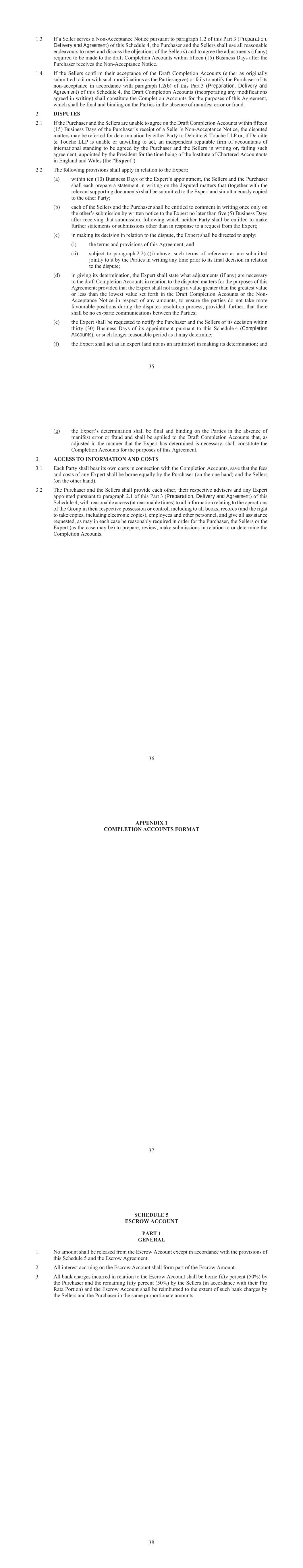 35 1.3 If a Seller serves a Non-Acceptance Notice pursuant to paragraph 1.2 of this Part 3 (Preparation, Delivery and Agreement) of this Schedule 4, the Purchaser and the Sellers shall use all reasonable endeavours to meet and discuss the objections of the Seller(s) and to agree the adjustments (if any) required to be made to the draft Completion Accounts within fifteen (15) Business Days after the Purchaser receives the Non-Acceptance Notice. 1.4 If the Sellers confirm their acceptance of the Draft Completion Accounts (either as originally submitted to it or with such modifications as the Parties agree) or fails to notify the Purchaser of its non-acceptance in accordance with paragraph 1.2(b) of this Part 3 (Preparation, Delivery and Agreement) of this Schedule 4, the Draft Completion Accounts (incorporating any modifications agreed in writing) shall constitute the Completion Accounts for the purposes of this Agreement, which shall be final and binding on the Parties in the absence of manifest error or fraud. 2. DISPUTES 2.1 If the Purchaser and the Sellers are unable to agree on the Draft Completion Accounts within fifteen (15) Business Days of the Purchaser’s receipt of a Seller’s Non-Acceptance Notice, the disputed matters may be referred for determination by either Party to Deloitte & Touche LLP or, if Deloitte & Touche LLP is unable or unwilling to act, an independent reputable firm of accountants of international standing to be agreed by the Purchaser and the Sellers in writing or, failing such agreement, appointed by the President for the time being of the Institute of Chartered Accountants in England and Wales (the “Expert”). 2.2 The following provisions shall apply in relation to the Expert: (a) within ten (10) Business Days of the Expert’s appointment, the Sellers and the Purchaser shall each prepare a statement in writing on the disputed matters that (together with the relevant supporting documents) shall be submitted to the Expert and simultaneously copied to the other Party; (b) each of the Sellers and the Purchaser shall be entitled to comment in writing once only on the other’s submission by written notice to the Expert no later than five (5) Business Days after receiving that submission, following which neither Party shall be entitled to make further statements or submissions other than in response to a request from the Expert; (c) in making its decision in relation to the dispute, the Expert shall be directed to apply: (i) the terms and provisions of this Agreement; and (ii) subject to paragraph 2.2(c)(i) above, such terms of reference as are submitted jointly to it by the Parties in writing any time prior to its final decision in relation to the dispute; (d) in giving its determination, the Expert shall state what adjustments (if any) are necessary to the draft Completion Accounts in relation to the disputed matters for the purposes of this Agreement; provided that the Expert shall not assign a value greater than the greatest value or less than the lowest value set forth in the Draft Completion Accounts or the Non- Acceptance Notice in respect of any amounts, to ensure the parties do not take more favourable positions during the disputes resolution process; provided, further, that there shall be no ex-parte communications between the Parties; (e) the Expert shall be requested to notify the Purchaser and the Sellers of its decision within thirty (30) Business Days of its appointment pursuant to this Schedule 4 (Completion Accounts), or such longer reasonable period as it may determine; (f) the Expert shall act as an expert (and not as an arbitrator) in making its determination; and 36 (g) the Expert’s determination shall be final and binding on the Parties in the absence of manifest error or fraud and shall be applied to the Draft Completion Accounts that, as adjusted in the manner that the Expert has determined is necessary, shall constitute the Completion Accounts for the purposes of this Agreement. 3. ACCESS TO INFORMATION AND COSTS 3.1 Each Party shall bear its own costs in connection with the Completion Accounts, save that the fees and costs of any Expert shall be borne equally by the Purchaser (on the one hand) and the Sellers (on the other hand). 3.2 The Purchaser and the Sellers shall provide each other, their respective advisers and any Expert appointed pursuant to paragraph 2.1 of this Part 3 (Preparation, Delivery and Agreement) of this Schedule 4, with reasonable access (at reasonable times) to all information relating to the operations of the Group in their respective possession or control, including to all books, records (and the right to take copies, including electronic copies), employees and other personnel, and give all assistance requested, as may in each case be reasonably required in order for the Purchaser, the Sellers or the Expert (as the case may be) to prepare, review, make submissions in relation to or determine the Completion Accounts. 37 APPENDIX 1 COMPLETION ACCOUNTS FORMAT 38 SCHEDULE 5 ESCROW ACCOUNT PART 1 GENERAL 1. No amount shall be released from the Escrow Account except in accordance with the provisions of this Schedule 5 and the Escrow Agreement. 2. All interest accruing on the Escrow Account shall form part of the Escrow Amount. 3. All bank charges incurred in relation to the Escrow Account shall be borne fifty percent (50%) by the Purchaser and the remaining fifty percent (50%) by the Sellers (in accordance with their Pro Rata Portion) and the Escrow Account shall be reimbursed to the extent of such bank charges by the Sellers and the Purchaser in the same proportionate amounts.