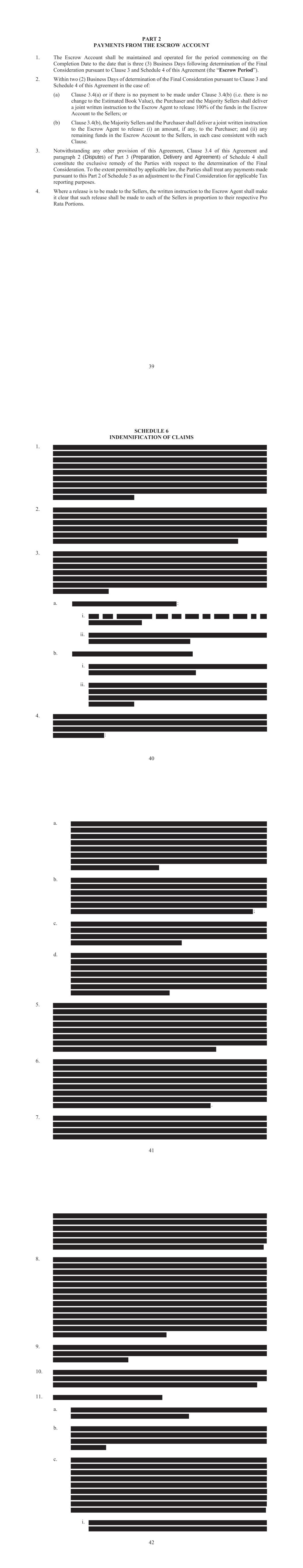 39 PART 2 PAYMENTS FROM THE ESCROW ACCOUNT 1. The Escrow Account shall be maintained and operated for the period commencing on the Completion Date to the date that is three (3) Business Days following determination of the Final Consideration pursuant to Clause 3 and Schedule 4 of this Agreement (the “Escrow Period”). 2. Within two (2) Business Days of determination of the Final Consideration pursuant to Clause 3 and Schedule 4 of this Agreement in the case of: (a) Clause 3.4(a) or if there is no payment to be made under Clause 3.4(b) (i.e. there is no change to the Estimated Book Value), the Purchaser and the Majority Sellers shall deliver a joint written instruction to the Escrow Agent to release 100% of the funds in the Escrow Account to the Sellers; or (b) Clause 3.4(b), the Majority Sellers and the Purchaser shall deliver a joint written instruction to the Escrow Agent to release: (i) an amount, if any, to the Purchaser; and (ii) any remaining funds in the Escrow Account to the Sellers, in each case consistent with such Clause. 3. Notwithstanding any other provision of this Agreement, Clause 3.4 of this Agreement and paragraph 2 (Disputes) of Part 3 (Preparation, Delivery and Agreement) of Schedule 4 shall constitute the exclusive remedy of the Parties with respect to the determination of the Final Consideration. To the extent permitted by applicable law, the Parties shall treat any payments made pursuant to this Part 2 of Schedule 5 as an adjustment to the Final Consideration for applicable Tax reporting purposes. 4. Where a release is to be made to the Sellers, the written instruction to the Escrow Agent shall make it clear that such release shall be made to each of the Sellers in proportion to their respective Pro Rata Portions. 40 SCHEDULE 6 INDEMNIFICATION OF CLAIMS 1. 2. 3. a. : i. ii. b. i. ii. 4. : 41 a. b. ; c. d. 5. 6. . 7. 42 8. 9. 10. 11. a. b. c. i.