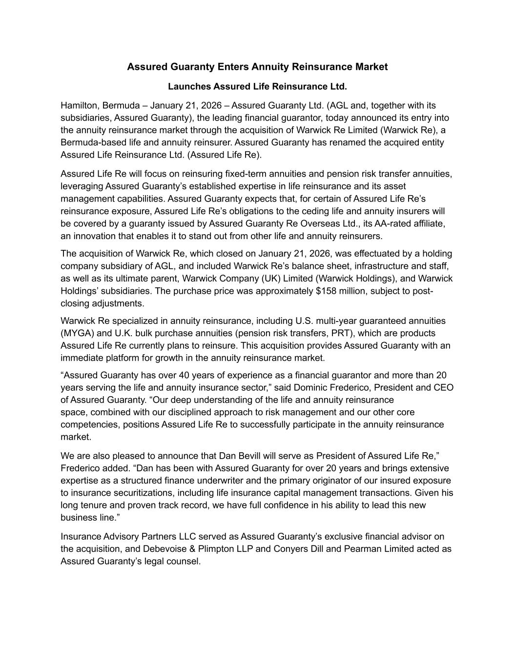 Assured Guaranty Enters Annuity Reinsurance Market Launches Assured Life Reinsurance Ltd. Hamilton, Bermuda – January 21, 2026 – Assured Guaranty Ltd. (AGL and, together with its subsidiaries, Assured Guaranty), the leading financial guarantor, today announced its entry into the annuity reinsurance market through the acquisition of Warwick Re Limited (Warwick Re), a Bermuda-based life and annuity reinsurer. Assured Guaranty has renamed the acquired entity Assured Life Reinsurance Ltd. (Assured Life Re). Assured Life Re will focus on reinsuring fixed-term annuities and pension risk transfer annuities, leveraging Assured Guaranty’s established expertise in life reinsurance and its asset management capabilities. Assured Guaranty expects that, for certain of Assured Life Re’s reinsurance exposure, Assured Life Re’s obligations to the ceding life and annuity insurers will be covered by a guaranty issued by Assured Guaranty Re Overseas Ltd., its AA-rated affiliate, an innovation that enables it to stand out from other life and annuity reinsurers. The acquisition of Warwick Re, which closed on January 21, 2026, was effectuated by a holding company subsidiary of AGL, and included Warwick Re’s balance sheet, infrastructure and staff, as well as its ultimate parent, Warwick Company (UK) Limited (Warwick Holdings), and Warwick Holdings’ subsidiaries. The purchase price was approximately $158 million, subject to post- closing adjustments. Warwick Re specialized in annuity reinsurance, including U.S. multi-year guaranteed annuities (MYGA) and U.K. bulk purchase annuities (pension risk transfers, PRT), which are products Assured Life Re currently plans to reinsure. This acquisition provides Assured Guaranty with an immediate platform for growth in the annuity reinsurance market. “Assured Guaranty has over 40 years of experience as a financial guarantor and more than 20 years serving the life and annuity insurance sector,” said Dominic Frederico, President and CEO of Assured Guaranty. “Our deep understanding of the life and annuity reinsurance space, combined with our disciplined approach to risk management and our other core competencies, positions Assured Life Re to successfully participate in the annuity reinsurance market. We are also pleased to announce that Dan Bevill will serve as President of Assured Life Re,” Frederico added. “Dan has been with Assured Guaranty for over 20 years and brings extensive expertise as a structured finance underwriter and the primary originator of our insured exposure to insurance securitizations, including life insurance capital management transactions. Given his long tenure and proven track record, we have full confidence in his ability to lead this new business line.” Insurance Advisory Partners LLC served as Assured Guaranty’s exclusive financial advisor on the acquisition, and Debevoise & Plimpton LLP and Conyers Dill and Pearman Limited acted as Assured Guaranty’s legal counsel.