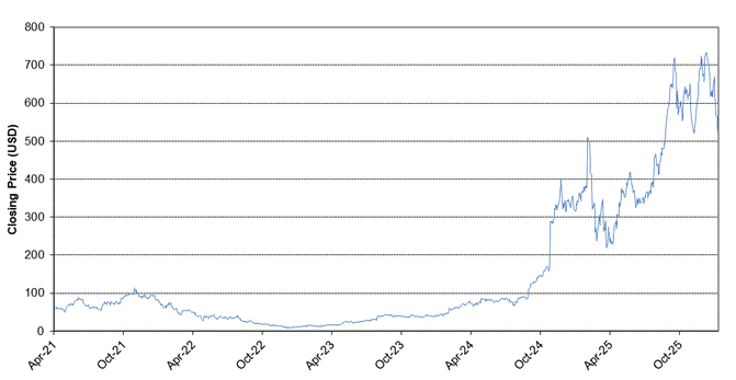 The graph below sets forth the historical performance of the APP Underlier based on the daily Closing Values from April 15, 2021 through January 22, 2026. The APP Stock began regular trading on The Nasdaq Stock Market on April 15, 2021 and therefore has limited performance history. We obtained the Closing Values shown in the graph below from Bloomberg Professional® service (“Bloomberg”). We have not independently verified the accuracy or completeness of the information obtained from Bloomberg. The Closing Values below may reflect adjustments in response to certain corporate actions, such as stock splits, public offerings, mergers and acquisitions, spin-offs, extraordinary dividends, delistings and bankruptcy.