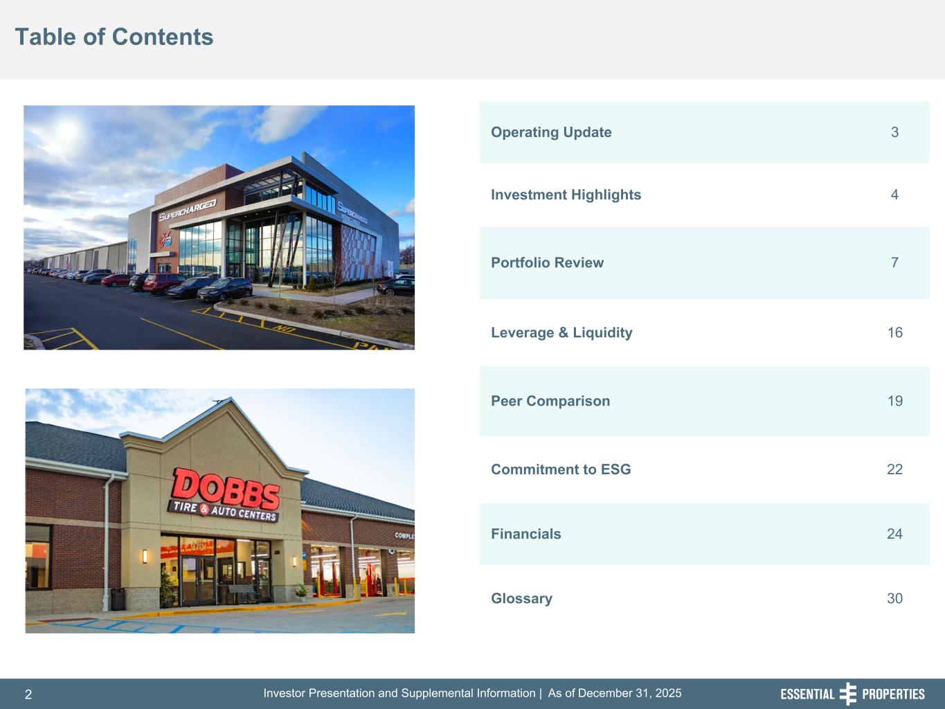 Investor Presentation and Supplemental Information | As of December 31, 20252 254, 192, 59 75, 108, 127 146, 204, 238 0, 0, 0 38, 169, 224 153, 223, 227 Table of Contents 242, 242, 242 Operating Update 3 Investment Highlights 4 Portfolio Review 7 Leverage & Liquidity 16 Peer Comparison 19 Commitment to ESG 22 Financials 24 Glossary 30