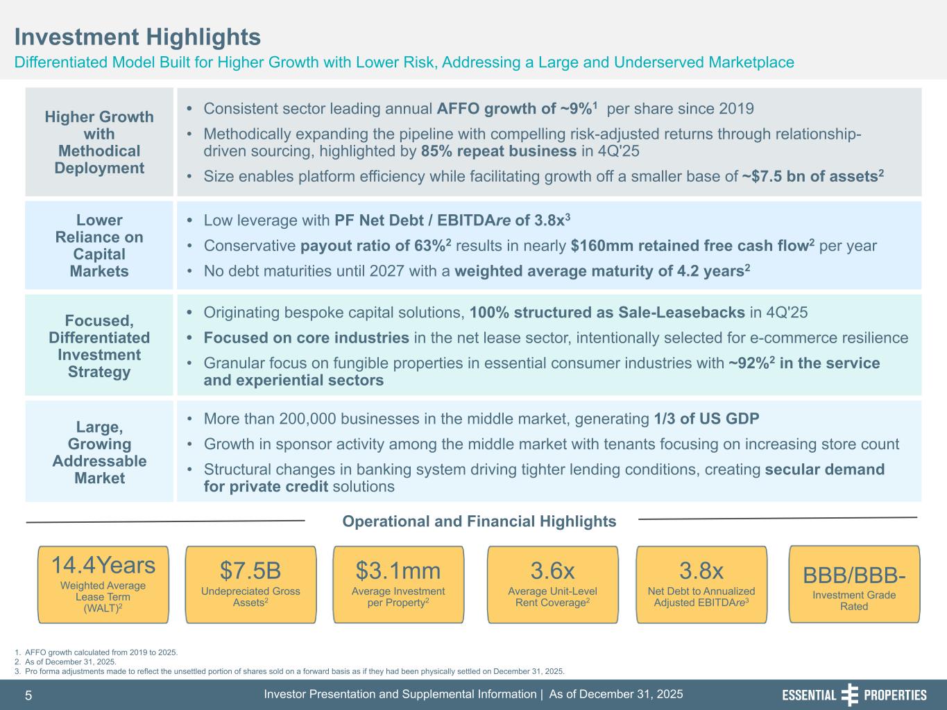 Investor Presentation and Supplemental Information | As of December 31, 20255 254, 192, 59 75, 108, 127 146, 204, 238 0, 0, 0 38, 169, 224 153, 223, 227 BBB/BBB- Investment Grade Rated • Originating bespoke capital solutions, 100% structured as Sale-Leasebacks in 4Q'25 • Focused on core industries in the net lease sector, intentionally selected for e-commerce resilience • Granular focus on fungible properties in essential consumer industries with ~92%2 in the service and experiential sectors Investment Highlights Differentiated Model Built for Higher Growth with Lower Risk, Addressing a Large and Underserved Marketplace 242, 242, 242 14.4Years Weighted Average Lease Term (WALT)2 3.6x Average Unit-Level Rent Coverage2 $3.1mm Average Investment per Property2 3.8x Net Debt to Annualized Adjusted EBITDAre3 $7.5B Undepreciated Gross Assets2 Higher Growth with Methodical Deployment • Consistent sector leading annual AFFO growth of ~9%1 per share since 2019 • Methodically expanding the pipeline with compelling risk-adjusted returns through relationship- driven sourcing, highlighted by 85% repeat business in 4Q'25 • Size enables platform efficiency while facilitating growth off a smaller base of ~$7.5 bn of assets2 Lower Reliance on Capital Markets • Low leverage with PF Net Debt / EBITDAre of 3.8x3 • Conservative payout ratio of 63%2 results in nearly $160mm retained free cash flow2 per year • No debt maturities until 2027 with a weighted average maturity of 4.2 years2 Focused, Differentiated Investment Strategy Large, Growing Addressable Market • More than 200,000 businesses in the middle market, generating 1/3 of US GDP • Growth in sponsor activity among the middle market with tenants focusing on increasing store count • Structural changes in banking system driving tighter lending conditions, creating secular demand for private credit solutions Operational and Financial Highlights 1. AFFO growth calculated from 2019 to 2025. 2. As of December 31, 2025. 3. Pro forma adjustments made to reflect the unsettled portion of shares sold on a forward basis as if they had been physically settled on December 31, 2025.
