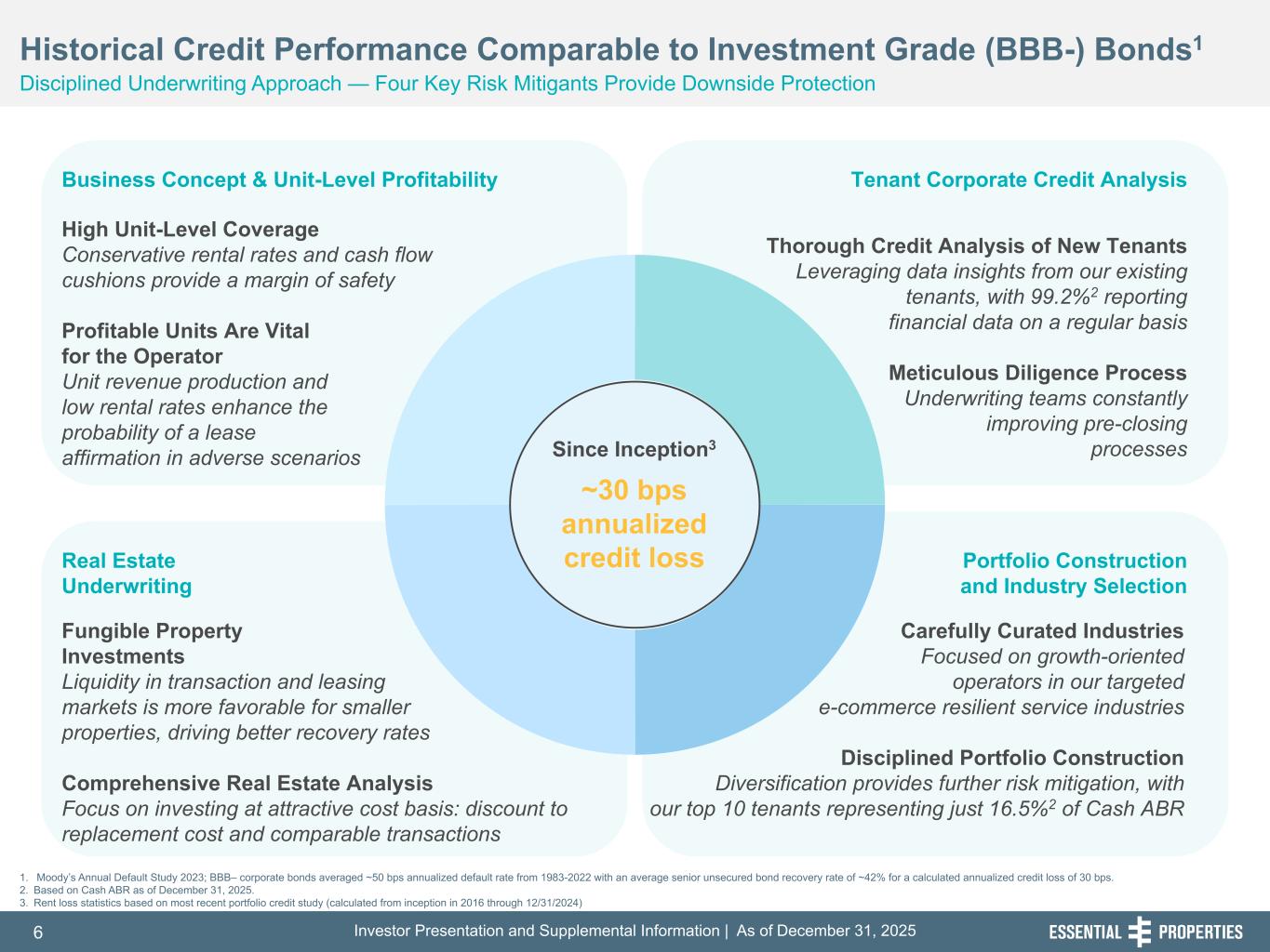 Investor Presentation and Supplemental Information | As of December 31, 20256 254, 192, 59 75, 108, 127 146, 204, 238 0, 0, 0 38, 169, 224 153, 223, 227 Historical Credit Performance Comparable to Investment Grade (BBB-) Bonds1 Disciplined Underwriting Approach — Four Key Risk Mitigants Provide Downside Protection Business Concept & Unit-Level Profitability Real Estate Underwriting Portfolio Construction and Industry Selection Tenant Corporate Credit Analysis High Unit-Level Coverage Conservative rental rates and cash flow cushions provide a margin of safety Profitable Units Are Vital for the Operator Unit revenue production and low rental rates enhance the probability of a lease affirmation in adverse scenarios Fungible Property Investments Liquidity in transaction and leasing markets is more favorable for smaller properties, driving better recovery rates Comprehensive Real Estate Analysis Focus on investing at attractive cost basis: discount to replacement cost and comparable transactions Thorough Credit Analysis of New Tenants Leveraging data insights from our existing tenants, with 99.2%2 reporting financial data on a regular basis Meticulous Diligence Process Underwriting teams constantly improving pre-closing processes Carefully Curated Industries Focused on growth-oriented operators in our targeted e-commerce resilient service industries Disciplined Portfolio Construction Diversification provides further risk mitigation, with our top 10 tenants representing just 16.5%2 of Cash ABR Since Inception3 ~30 bps annualized credit loss 1. Moody’s Annual Default Study 2023; BBB– corporate bonds averaged ~50 bps annualized default rate from 1983-2022 with an average senior unsecured bond recovery rate of ~42% for a calculated annualized credit loss of 30 bps. 2. Based on Cash ABR as of December 31, 2025. 3. Rent loss statistics based on most recent portfolio credit study (calculated from inception in 2016 through 12/31/2024)