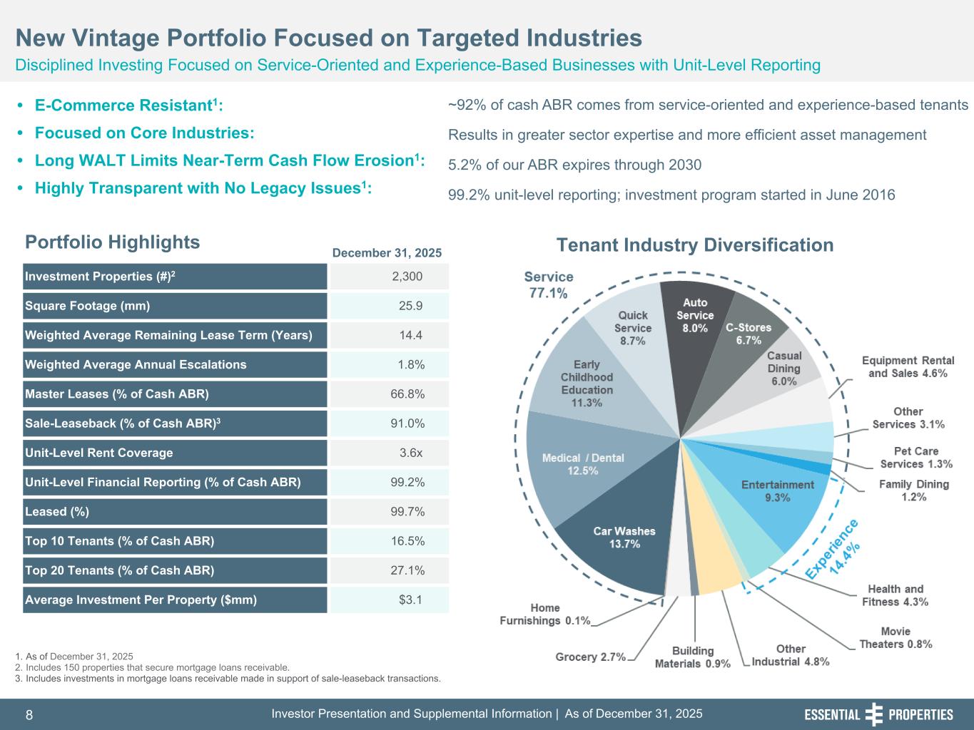 Investor Presentation and Supplemental Information | As of December 31, 20258 254, 192, 59 75, 108, 127 146, 204, 238 0, 0, 0 38, 169, 224 153, 223, 227 242, 242, 242 1. As of December 31, 2025 2. Includes 150 properties that secure mortgage loans receivable. 3. Includes investments in mortgage loans receivable made in support of sale-leaseback transactions. December 31, 2025 Investment Properties (#)2 2,300 Square Footage (mm) 25.9 Weighted Average Remaining Lease Term (Years) 14.4 Weighted Average Annual Escalations 1.8 % Master Leases (% of Cash ABR) 66.8 % Sale-Leaseback (% of Cash ABR)3 91.0 % Unit-Level Rent Coverage 3.6x Unit-Level Financial Reporting (% of Cash ABR) 99.2 % Leased (%) 99.7 % Top 10 Tenants (% of Cash ABR) 16.5 % Top 20 Tenants (% of Cash ABR) 27.1 % Average Investment Per Property ($mm) $3.1 New Vintage Portfolio Focused on Targeted Industries Disciplined Investing Focused on Service-Oriented and Experience-Based Businesses with Unit-Level Reporting Portfolio Highlights • E-Commerce Resistant1: • Focused on Core Industries: • Long WALT Limits Near-Term Cash Flow Erosion1: • Highly Transparent with No Legacy Issues1: ~92% of cash ABR comes from service-oriented and experience-based tenants Results in greater sector expertise and more efficient asset management 5.2% of our ABR expires through 2030 99.2% unit-level reporting; investment program started in June 2016 Tenant Industry Diversification