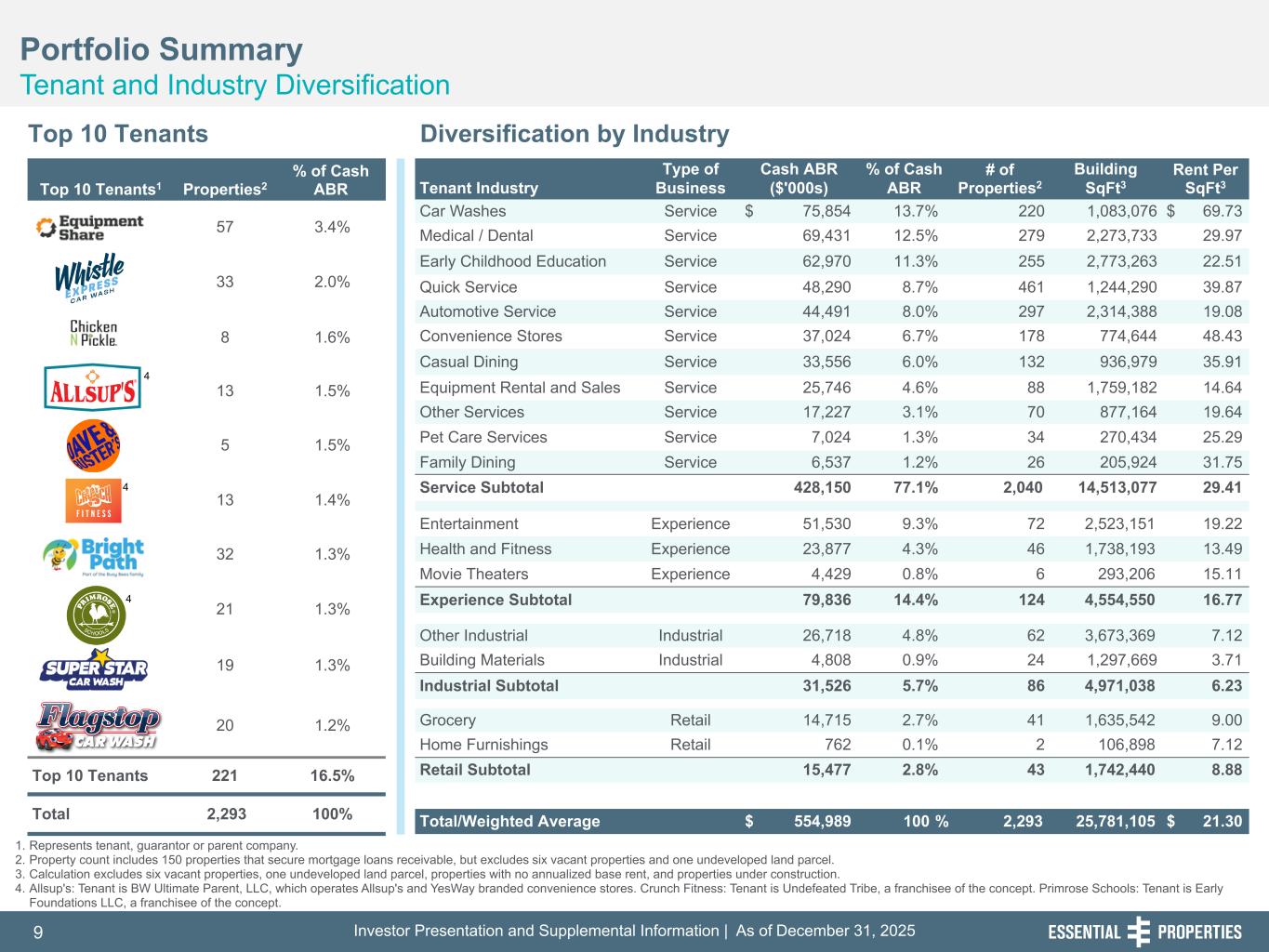 Investor Presentation and Supplemental Information | As of December 31, 20259 254, 192, 59 75, 108, 127 146, 204, 238 0, 0, 0 38, 169, 224 153, 223, 227 Top 10 Tenants1 Properties2 % of Cash ABR 57 3.4% 33 2.0% 8 1.6% 13 1.5% 5 1.5% 13 1.4% 32 1.3% 21 1.3% 19 1.3% 20 1.2% Top 10 Tenants 221 16.5% Total 2,293 100% 1. Represents tenant, guarantor or parent company. 2. Property count includes 150 properties that secure mortgage loans receivable, but excludes six vacant properties and one undeveloped land parcel. 3. Calculation excludes six vacant properties, one undeveloped land parcel, properties with no annualized base rent, and properties under construction. 4. Allsup's: Tenant is BW Ultimate Parent, LLC, which operates Allsup's and YesWay branded convenience stores. Crunch Fitness: Tenant is Undefeated Tribe, a franchisee of the concept. Primrose Schools: Tenant is Early Foundations LLC, a franchisee of the concept. Portfolio Summary Tenant and Industry Diversification 242, 242, 242 Top 10 Tenants Diversification by Industry Tenant Industry Type of Business Cash ABR ($'000s) % of Cash ABR # of Properties2 Building SqFt3 Rent Per SqFt3 Car Washes Service $ 75,854 13.7 % 220 1,083,076 $ 69.73 Medical / Dental Service 69,431 12.5 % 279 2,273,733 29.97 Early Childhood Education Service 62,970 11.3 % 255 2,773,263 22.51 Quick Service Service 48,290 8.7 % 461 1,244,290 39.87 Automotive Service Service 44,491 8.0 % 297 2,314,388 19.08 Convenience Stores Service 37,024 6.7 % 178 774,644 48.43 Casual Dining Service 33,556 6.0 % 132 936,979 35.91 Equipment Rental and Sales Service 25,746 4.6 % 88 1,759,182 14.64 Other Services Service 17,227 3.1 % 70 877,164 19.64 Pet Care Services Service 7,024 1.3 % 34 270,434 25.29 Family Dining Service 6,537 1.2 % 26 205,924 31.75 Service Subtotal 428,150 77.1 % 2,040 14,513,077 29.41 Entertainment Experience 51,530 9.3 % 72 2,523,151 19.22 Health and Fitness Experience 23,877 4.3 % 46 1,738,193 13.49 Movie Theaters Experience 4,429 0.8 % 6 293,206 15.11 Experience Subtotal 79,836 14.4 % 124 4,554,550 16.77 Other Industrial Industrial 26,718 4.8 % 62 3,673,369 7.12 Building Materials Industrial 4,808 0.9 % 24 1,297,669 3.71 Industrial Subtotal 31,526 5.7 % 86 4,971,038 6.23 Grocery Retail 14,715 2.7 % 41 1,635,542 9.00 Home Furnishings Retail 762 0.1 % 2 106,898 7.12 Retail Subtotal 15,477 2.8 % 43 1,742,440 8.88 Total/Weighted Average $ 554,989 100 % 2,293 25,781,105 $ 21.30 4 4 4