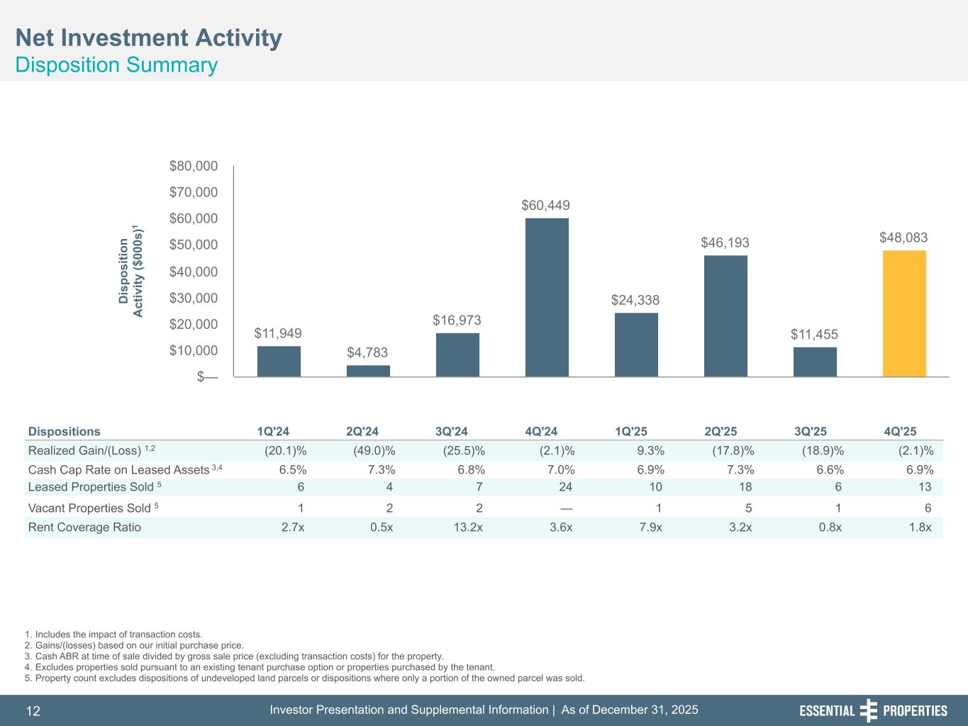 Investor Presentation and Supplemental Information | As of December 31, 202512 254, 192, 59 75, 108, 127 146, 204, 238 0, 0, 0 38, 169, 224 153, 223, 227 Net Investment Activity Disposition Summary 242, 242, 242 1. Includes the impact of transaction costs. 2. Gains/(losses) based on our initial purchase price. 3. Cash ABR at time of sale divided by gross sale price (excluding transaction costs) for the property. 4. Excludes properties sold pursuant to an existing tenant purchase option or properties purchased by the tenant. 5. Property count excludes dispositions of undeveloped land parcels or dispositions where only a portion of the owned parcel was sold. Dispositions 1Q'24 2Q'24 3Q'24 4Q'24 1Q'25 2Q'25 3Q'25 4Q'25 Realized Gain/(Loss) 1,2 (20.1) % (49.0) % (25.5) % (2.1) % 9.3 % (17.8) % (18.9) % (2.1) % Cash Cap Rate on Leased Assets 3,4 6.5 % 7.3 % 6.8 % 7.0 % 6.9 % 7.3 % 6.6 % 6.9 % Leased Properties Sold 5 6 4 7 24 10 18 6 13 Vacant Properties Sold 5 1 2 2 — 1 5 1 6 Rent Coverage Ratio 2.7x 0.5x 13.2x 3.6x 7.9x 3.2x 0.8x 1.8x $11,949 $4,783 $16,973 $60,449 $24,338 $46,193 $11,455 $48,083 $— $10,000 $20,000 $30,000 $40,000 $50,000 $60,000 $70,000 $80,000 D is po si tio n A ct iv ity ($ 00 0s )1