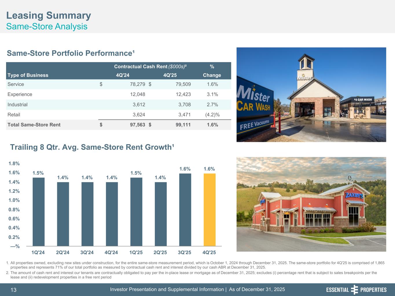 Investor Presentation and Supplemental Information | As of December 31, 202513 254, 192, 59 75, 108, 127 146, 204, 238 0, 0, 0 38, 169, 224 153, 223, 227 Leasing Summary Same-Store Analysis 242, 242, 242 Same-Store Portfolio Performance¹ Contractual Cash Rent ($000s)² % Type of Business 4Q'24 4Q'25 Change Service $ 78,279 $ 79,509 1.6% Experience 12,048 12,423 3.1% Industrial 3,612 3,708 2.7% Retail 3,624 3,471 (4.2)% Total Same-Store Rent $ 97,563 $ 99,111 1.6% 1.5% 1.4% 1.4% 1.4% 1.5% 1.4% 1.6% 1.6% 1Q'24 2Q'24 3Q'24 4Q'24 1Q'25 2Q'25 3Q'25 4Q'25 —% 0.2% 0.4% 0.6% 0.8% 1.0% 1.2% 1.4% 1.6% 1.8% 1. All properties owned, excluding new sites under construction, for the entire same-store measurement period, which is October 1, 2024 through December 31, 2025. The same-store portfolio for 4Q'25 is comprised of 1,865 properties and represents 71% of our total portfolio as measured by contractual cash rent and interest divided by our cash ABR at December 31, 2025. 2. The amount of cash rent and interest our tenants are contractually obligated to pay per the in-place lease or mortgage as of December 31, 2025; excludes (i) percentage rent that is subject to sales breakpoints per the lease and (ii) redevelopment properties in a free rent period Trailing 8 Qtr. Avg. Same-Store Rent Growth¹