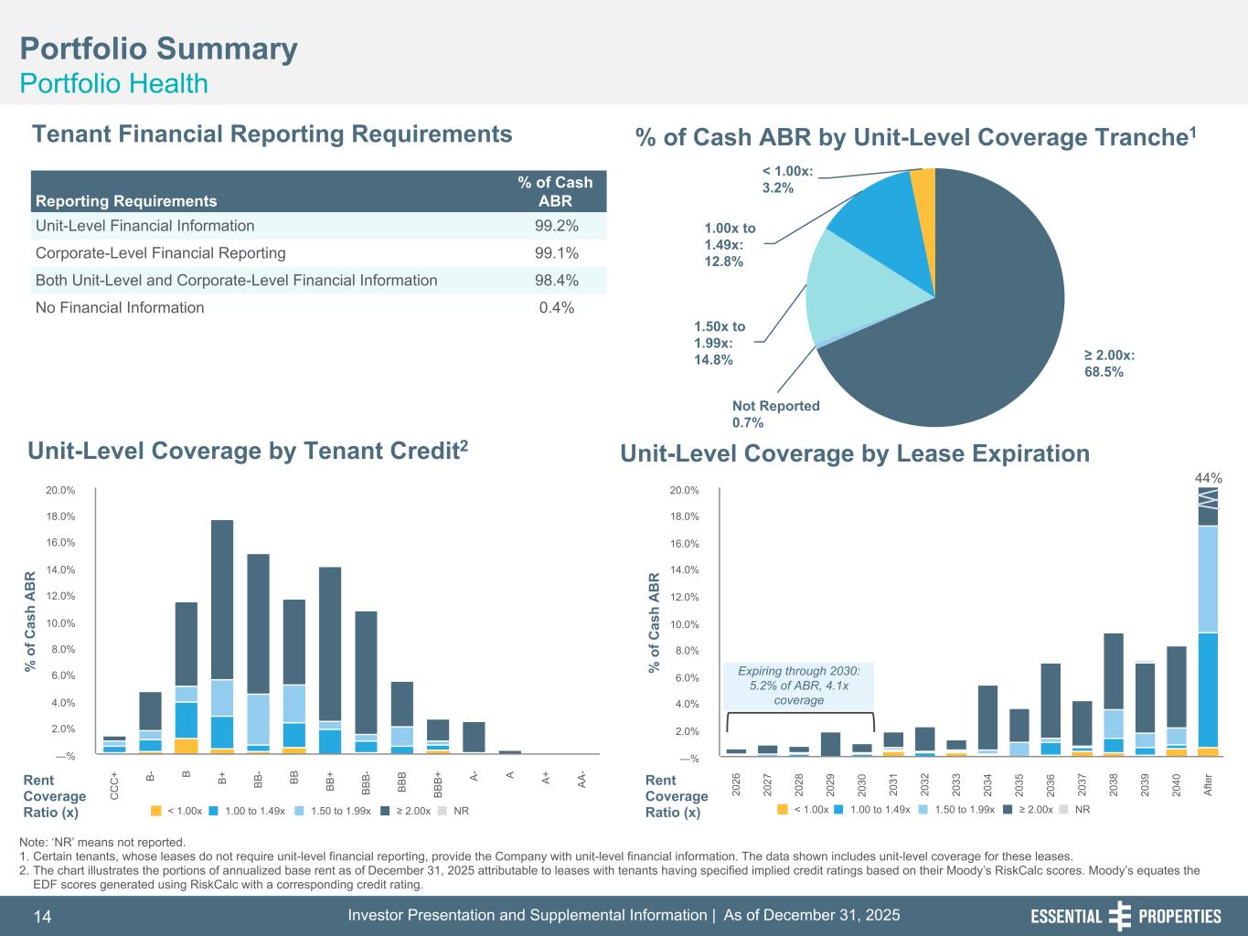 Investor Presentation and Supplemental Information | As of December 31, 20253 254, 192, 59 75, 108, 127 146, 204, 238 0, 0, 0 38, 169, 224 153, 223, 227 Healthy Net Lease Portfolio1 • Stable Portfolio: 99.7% leased; same-store rent growth has averaged 1.5% over the last four quarters • Strong Coverage: Unit-level coverage of 3.6x with ~99% of ABR required to report unit-level P&Ls • De-Minimis Lease Expiration Risk: Only 5.2% of ABR (4.1x coverage) expiring through 2030 • Fungible & Diversified: Average asset size is $3.1mm; Top 10 tenants represent just 16.5% of ABR Well Positioned Balance Sheet And Liquidity • Balance Sheet Strength: In 4Q'25, raised ~$170mm of common equity through ATM Program, leaving ~$332 million of net proceeds available from unsettled forward equity as of December 31, 2025 • Investment Grade Balance Sheet: Asset base is 100% unencumbered with no secured debt • Low Leverage2: Proforma Net Debt / Annualized Adjusted EBITDAre of 3.8x at 4Q'25-end • Excellent Liquidity2: ~$1.4bn of pro forma liquidity • Well-Laddered Low-Cost Debt: Weighted average debt maturity is 4.2 years, and weighted average interest rate is 4.23% Consistent & Disciplined External Growth • Investment Activity Remains Healthy at Attractive Cap Rates: Closed investments of ~$296 million3 at an initial cash yield of ~7.7% • Accretive Capital Recycling: Closed ~$48 million of dispositions3 at 6.9% cash yield and continue to selectively recycle capital at attractive prices 1. As of December 31, 2025. 2. Pro forma adjustments made to reflect the unsettled portion of shares sold on a forward basis as if they had been physically settled on December 31, 2025. 3. Completed investments and dispositions from October 1, 2025 through December 31, 2025. Includes transaction costs. Fourth Quarter 2025 Operating Update Continuing to Execute Our Business Plan