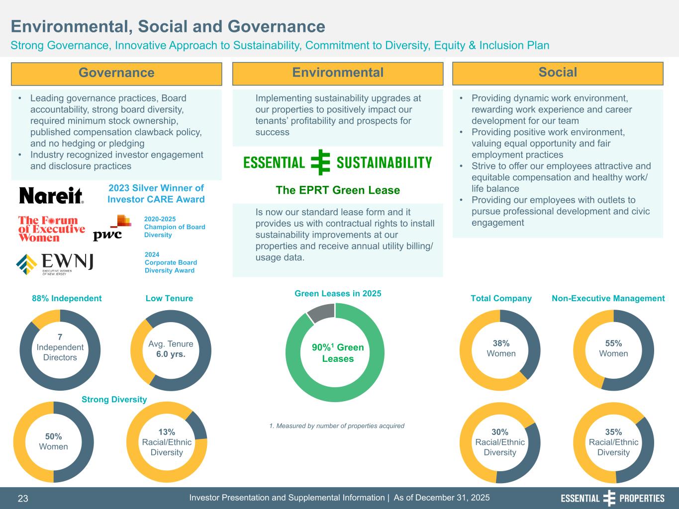 Investor Presentation and Supplemental Information | As of December 31, 202523 254, 192, 59 75, 108, 127 146, 204, 238 0, 0, 0 38, 169, 224 153, 223, 227 Governance • Leading governance practices, Board accountability, strong board diversity, required minimum stock ownership, published compensation clawback policy, and no hedging or pledging • Industry recognized investor engagement and disclosure practices Environmental, Social and Governance Strong Governance, Innovative Approach to Sustainability, Commitment to Diversity, Equity & Inclusion Plan Environmental Social Implementing sustainability upgrades at our properties to positively impact our tenants’ profitability and prospects for success • Providing dynamic work environment, rewarding work experience and career development for our team • Providing positive work environment, valuing equal opportunity and fair employment practices • Strive to offer our employees attractive and equitable compensation and healthy work/ life balance • Providing our employees with outlets to pursue professional development and civic engagement 30% Racial/Ethnic Diversity 38% Women 35% Racial/Ethnic Diversity 55% Women Total Company Non-Executive Management 90%1 Green Leases 1. Measured by number of properties acquired 2020-2025 Champion of Board Diversity Avg. Tenure 6.0 yrs. 7 Independent Directors 50% Women 13% Racial/Ethnic Diversity Green Leases in 202588% Independent Low Tenure Strong Diversity 2023 Silver Winner of Investor CARE Award Is now our standard lease form and it provides us with contractual rights to install sustainability improvements at our properties and receive annual utility billing/ usage data. The EPRT Green Lease 2024 Corporate Board Diversity Award