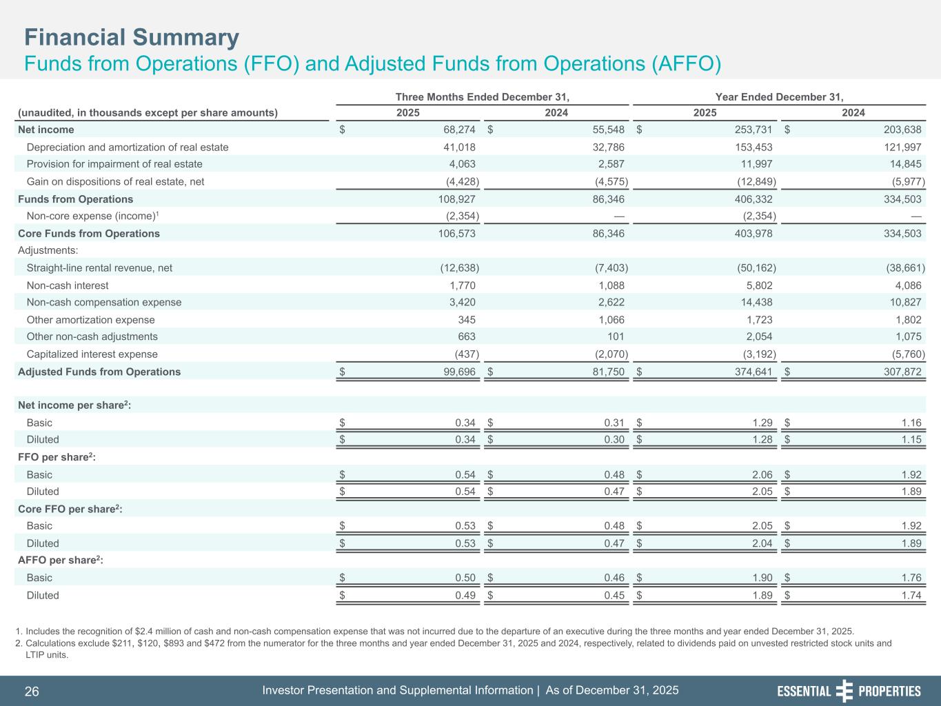 Investor Presentation and Supplemental Information | As of December 31, 202526 254, 192, 59 75, 108, 127 146, 204, 238 0, 0, 0 38, 169, 224 153, 223, 227 Financial Summary Funds from Operations (FFO) and Adjusted Funds from Operations (AFFO) 1. Includes the recognition of $2.4 million of cash and non-cash compensation expense that was not incurred due to the departure of an executive during the three months and year ended December 31, 2025. 2. Calculations exclude $211, $120, $893 and $472 from the numerator for the three months and year ended December 31, 2025 and 2024, respectively, related to dividends paid on unvested restricted stock units and LTIP units. 242, 242, 242 Three Months Ended December 31, Year Ended December 31, (unaudited, in thousands except per share amounts) 2025 2024 2025 2024 Net income $ 68,274 $ 55,548 $ 253,731 $ 203,638 Depreciation and amortization of real estate 41,018 32,786 153,453 121,997 Provision for impairment of real estate 4,063 2,587 11,997 14,845 Gain on dispositions of real estate, net (4,428) (4,575) (12,849) (5,977) Funds from Operations 108,927 86,346 406,332 334,503 Non-core expense (income)1 (2,354) — (2,354) — Core Funds from Operations 106,573 86,346 403,978 334,503 Adjustments: Straight-line rental revenue, net (12,638) (7,403) (50,162) (38,661) Non-cash interest 1,770 1,088 5,802 4,086 Non-cash compensation expense 3,420 2,622 14,438 10,827 Other amortization expense 345 1,066 1,723 1,802 Other non-cash adjustments 663 101 2,054 1,075 Capitalized interest expense (437) (2,070) (3,192) (5,760) Adjusted Funds from Operations $ 99,696 $ 81,750 $ 374,641 $ 307,872 Net income per share2: Basic $ 0.34 $ 0.31 $ 1.29 $ 1.16 Diluted $ 0.34 $ 0.30 $ 1.28 $ 1.15 FFO per share2: Basic $ 0.54 $ 0.48 $ 2.06 $ 1.92 Diluted $ 0.54 $ 0.47 $ 2.05 $ 1.89 Core FFO per share2: Basic $ 0.53 $ 0.48 $ 2.05 $ 1.92 Diluted $ 0.53 $ 0.47 $ 2.04 $ 1.89 AFFO per share2: Basic $ 0.50 $ 0.46 $ 1.90 $ 1.76 Diluted $ 0.49 $ 0.45 $ 1.89 $ 1.74