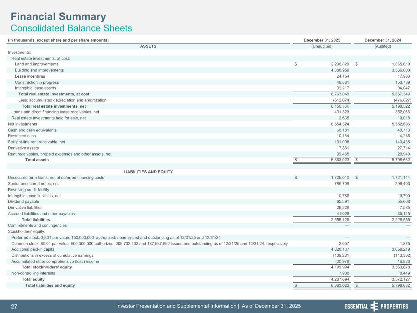 Investor Presentation and Supplemental Information | As of December 31, 202527 254, 192, 59 75, 108, 127 146, 204, 238 0, 0, 0 38, 169, 224 153, 223, 227 Financial Summary Consolidated Balance Sheets 242, 242, 242 (in thousands, except share and per share amounts) December 31, 2025 December 31, 2024 ASSETS (Unaudited) (Audited) Investments: Real estate investments, at cost: Land and improvements $ 2,200,829 $ 1,865,610 Building and improvements 4,388,959 3,536,000 Lease incentives 24,154 17,903 Construction in progress 49,881 153,789 Intangible lease assets 99,217 94,047 Total real estate investments, at cost 6,763,040 5,667,349 Less: accumulated depreciation and amortization (612,674) (476,827) Total real estate investments, net 6,150,366 5,190,522 Loans and direct financing lease receivables, net 401,323 352,066 Real estate investments held for sale, net 2,635 10,018 Net investments 6,554,324 5,552,606 Cash and cash equivalents 60,181 40,713 Restricted cash 10,184 4,265 Straight-line rent receivable, net 191,008 143,435 Derivative assets 7,861 27,714 Rent receivables, prepaid expenses and other assets, net 39,465 29,949 Total assets $ 6,863,023 $ 5,798,682 LIABILITIES AND EQUITY Unsecured term loans, net of deferred financing costs $ 1,725,010 $ 1,721,114 Senior unsecured notes, net 786,708 396,403 Revolving credit facility — — Intangible lease liabilities, net 10,766 10,700 Dividend payable 65,391 55,608 Derivative liabilities 26,226 7,585 Accrued liabilities and other payables 41,028 35,145 Total liabilities 2,655,129 2,226,555 Commitments and contingencies — — Stockholders' equity: Preferred stock, $0.01 par value; 150,000,000 authorized; none issued and outstanding as of 12/31/25 and 12/31/24 — — Common stock, $0.01 par value; 500,000,000 authorized; 209,702,433 and 187,537,592 issued and outstanding as of 12/31/25 and 12/31/24, respectively 2,097 1,875 Additional paid-in capital 4,328,137 3,658,219 Distributions in excess of cumulative earnings (109,261) (113,302) Accumulated other comprehensive (loss) income (20,979) 16,886 Total stockholders' equity 4,199,994 3,563,678 Non-controlling interests 7,900 8,449 Total equity 4,207,894 3,572,127 Total liabilities and equity $ 6,863,023 $ 5,798,682