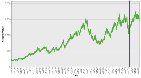 The closing value of the underlying on February 11, 2026 was 1,517.673. The graph below shows the hypothetical back-tested closing values of the underlying for the period from January 4, 2016 to April 25, 2025, and historical closing values of the underlying for the period April 28, 2025 to February 11, 2026.  All data to the left of the vertical red line in the graph below are hypothetical and back-tested.  We obtained the closing values from Bloomberg L.P., without independent verification.  You should not take the hypothetical back-tested and historical values of the underlying as an indication of future performance.
