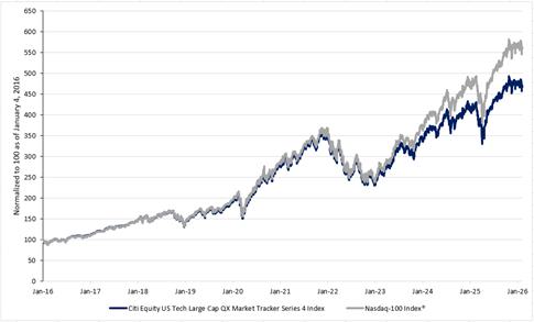 The underlying tracks exposure to the Citi Equity US Tech Large Cap QX Market Tracker Series 4 Index, which we refer to as the “underlying futures index”, on a volatility-targeted basis, less a decrement of 6% per annum.  The underlying has a volatility target of 35%, which it attempts to achieve by applying leverage to its exposure to the underlying futures index (up to a maximum of 500%) when the implied volatility of the Nasdaq-100 Index is less than its volatility target, and by reducing its exposure to the underlying futures index below 100% when the implied volatility of the Nasdaq-100 Index is greater than its volatility target.