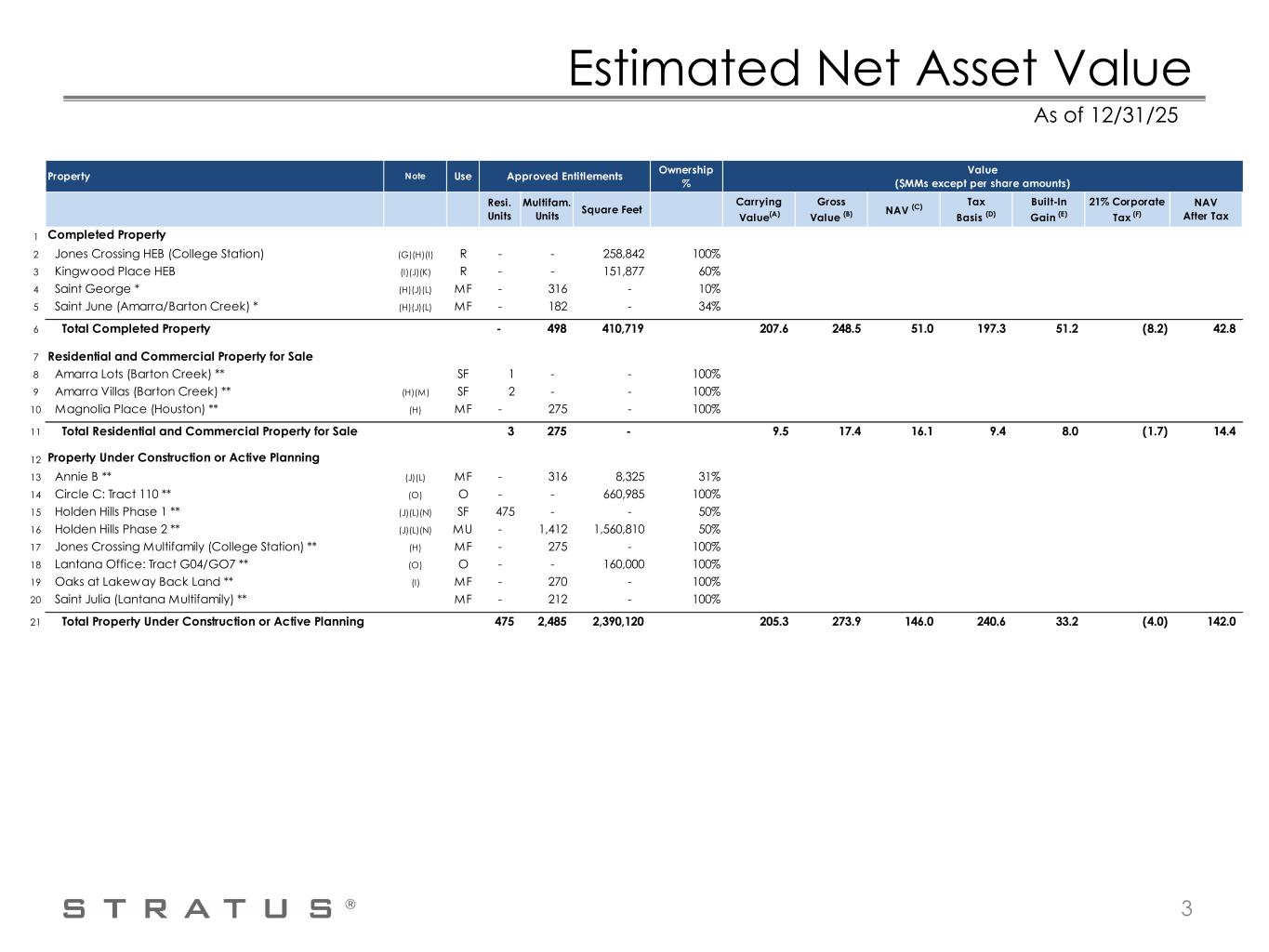GAAP Reconciliation After-tax NAV estimates the market value of Stratus' assets (gross value) and subtracts the book value of Stratus' total liabilities reported under GAAP (excluding deferred financing costs presented in debt), value attributable to third party owners, estimated H-E-B, LP (H-E-B) profits interests and awards under the Profit Participation Incentive Plan and Long Term Incentive Plan, and estimated income taxes computed on the difference between the estimated market values and the tax basis of the assets. Stratus also presents the non-GAAP measure after-tax NAV per share, which is after-tax NAV divided by shares of its common stock outstanding as of December 31, 2025, plus all outstanding restricted stock units. The computation of Stratus' after-tax NAV primarily uses third-party appraisals conducted by independent appraisal firms, which were primarily retained by Stratus' lenders as required under its financing arrangements. The appraisal firms represent in their reports that they employ certified appraisers with local knowledge and expertise who are Members of the Appraisal Institute (MAI) certified by the Appraisal Institute and/or state certified as a Certified General Real Estate Appraiser. Each appraisal states that it is prepared in conformity with the Uniform Standards of Professional Appraisal Practice and utilizes at least one of the following three approaches to value: 1. the cost approach, which establishes value by estimating the current costs of reproducing the improvements (less loss in value from depreciation) and adding land value to it; 2. the income capitalization approach, which establishes value based on the capitalization of the subject property’s net operating income; and/or 3. the sales comparison approach, which establishes value indicated by recent sales of comparable properties in the market place. One or more of the approaches may be selected by the appraiser depending on its applicability to the property being appraised. To the extent more than one approach is used, the appraiser performs a reconciliation of the indicated values to determine a final opinion of value for the subject property. Significant professional judgment is exercised by the appraiser in determining which inputs are used, which approaches to select, and the weight given to each selected approach in determining a final opinion as to the appraised value of the subject property. Stratus is a residential and retail focused real estate company and its portfolio of real estate assets includes multi-family and single-family residential and commercial real estate properties. Consequently, each appraisal is unique and certain factors reviewed and evaluated in each appraisal may be particular to the nature of the property being appraised. However, in performing their analyses, the appraisers generally (i) performed site visits to the properties, (ii) performed independent inspections and/or surveys of the market area and neighborhood, (iii) performed a highest and best use analysis, (iv) reviewed property-level information, including, but not limited to, ownership history, location, availability of utilities, topography, land improvements and zoning, and (v) reviewed information from a variety of sources about regional market data and trends applicable to the property being appraised. Depending on the valuation approach utilized, the appraisers may have used one or more of the following: the recent sales prices of comparable properties; market rents for comparable properties; operating and/or holding costs of comparable properties; and market capitalization and discount rates. The values for Kingwood Place, the retail component of Jones Crossing and one of the Amarra Villas homes as of December 31, 2025, were based on the prices in the respective sales contracts or offer, in the case of Jones Crossing, rather than appraised values. The appraisals of the specified properties are as of the dates so indicated, and the appraised value may be different if prepared as of a current date. As noted above, the appraisers utilize significant professional judgment in determining the appraisal methodology best suited to a particular property and the weight afforded to the various inputs considered, which could vary depending on the appraiser’s evaluation of the property being appraised. Moreover, the opinions expressed in the appraisals are based on estimates and forecasts that are prospective in nature and subject to certain risks and uncertainties. Events may occur that could cause the performance of the properties to materially differ from the estimates utilized by the appraiser, such as changes in the economy, inflation, interest rates, capitalization rates, the financial strength of certain tenants, and the behavior of investors, lenders and consumers. Additionally, in some situations, the opinions and forecasts utilized by the appraiser may be partly based on information obtained from third party sources, which information neither Stratus nor the appraiser verifies. Stratus reviews the appraisals to confirm that the information provided by Stratus to the appraiser is accurately reflected in the appraisal, but Stratus does not validate the methodologies, inputs and professional judgment utilized by the certified appraiser. 7