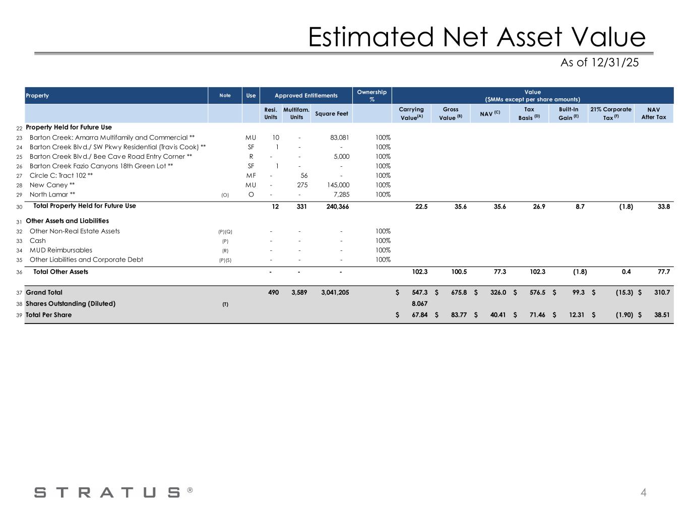 Estimated Net Asset Value 3 As of 12/31/25 Property Note Use Ownership % Value ($MMs except per share amounts) 1 Completed Property 2 Jones Crossing HEB (College Station) (G)(H)(I) R - - 258,842 100% 3 Kingwood Place HEB (I)(J)(K) R - - 151,877 60% 4 Saint George * (H)(J)(L) MF - 316 - 10% 5 Saint June (Amarra/Barton Creek) * (H)(J)(L) MF - 182 - 34% 6 Total Completed Property - 498 410,719 207.6 248.5 51.0 197.3 51.2 (8.2) 42.8 7 Residential and Commercial Property for Sale 8 Amarra Lots (Barton Creek) ** SF 1 - - 100% 9 Amarra Villas (Barton Creek) ** (H)(M) SF 2 - - 100% 10 Magnolia Place (Houston) ** (H) MF - 275 - 100% 11 Total Residential and Commercial Property for Sale 3 275 - 9.5 17.4 16.1 9.4 8.0 (1.7) 14.4 12 Property Under Construction or Active Planning 13 Annie B ** (J)(L) MF - 316 8,325 31% 14 Circle C: Tract 110 ** (O) O - - 660,985 100% 15 Holden Hills Phase 1 ** (J)(L)(N) SF 475 - - 50% 16 Holden Hills Phase 2 ** (J)(L)(N) MU - 1,412 1,560,810 50% 17 Jones Crossing Multifamily (College Station) ** (H) MF - 275 - 100% 18 Lantana Office: Tract G04/GO7 ** (O) O - - 160,000 100% 19 Oaks at Lakeway Back Land ** (I) MF - 270 - 100% 20 Saint Julia (Lantana Multifamily) ** MF - 212 - 100% 21 Total Property Under Construction or Active Planning 475 2,485 2,390,120 205.3 273.9 146.0 240.6 33.2 (4.0) 142.0 NAV (C) Tax Basis (D) Built-In Gain (E) 21% Corporate Tax (F) NAV After Tax Approved Entitlements Resi. Units Multifam. Units Square Feet Carrying Value(A) Gross Value (B)