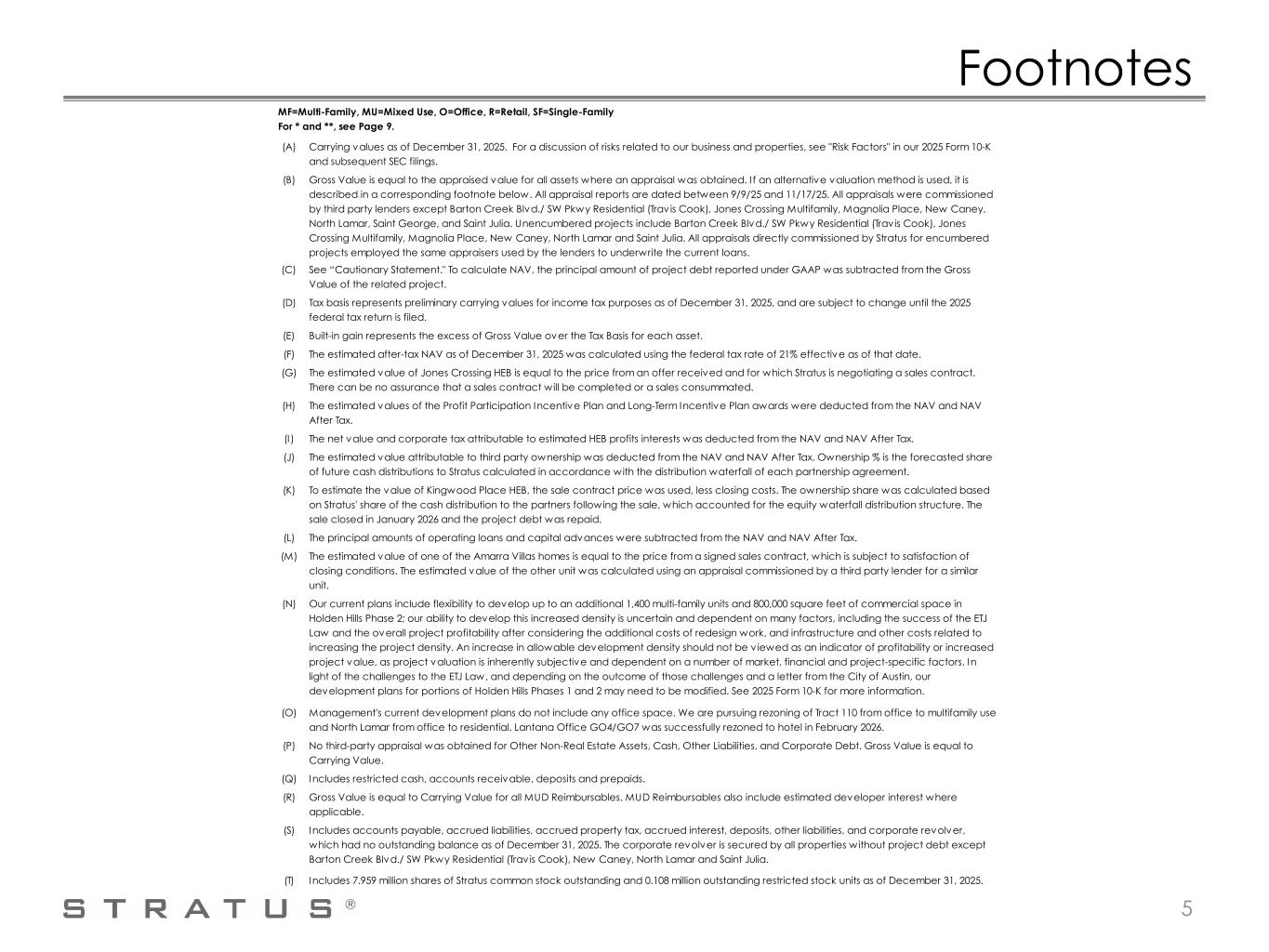 Footnotes 5 MF=Multi-Family, MU=Mixed Use, O=Office, R=Retail, SF=Single-Family For * and **, see Page 9. (A) Carrying values as of December 31, 2025. For a discussion of risks related to our business and properties, see "Risk Factors" in our 2025 Form 10-K and subsequent SEC filings. (B) Gross Value is equal to the appraised value for all assets where an appraisal was obtained. I f an alternative valuation method is used, it is described in a corresponding footnote below. All appraisal reports are dated between 9/9/25 and 11/17/25. All appraisals were commissioned by third party lenders except Barton Creek Blvd./ SW Pkwy Residential (Trav is Cook), Jones Crossing Multifamily, Magnolia Place, New Caney, North Lamar, Saint George, and Saint Julia. Unencumbered projects include Barton Creek Blvd./ SW Pkwy Residential (Trav is Cook), Jones Crossing Multifamily, Magnolia Place, New Caney, North Lamar and Saint Julia. All appraisals directly commissioned by Stratus for encumbered projects employed the same appraisers used by the lenders to underwrite the current loans. (C) See “Cautionary Statement." To calculate NAV, the principal amount of project debt reported under GAAP was subtracted from the Gross Value of the related project. (D) Tax basis represents preliminary carrying values for income tax purposes as of December 31, 2025, and are subject to change until the 2025 federal tax return is filed. (E) Built-in gain represents the excess of Gross Value over the Tax Basis for each asset. (F) The estimated after-tax NAV as of December 31, 2025 was calculated using the federal tax rate of 21% effective as of that date. (G) The estimated value of Jones Crossing HEB is equal to the price from an offer received and for which Stratus is negotiating a sales contract. There can be no assurance that a sales contract will be completed or a sales consummated. (H) The estimated values of the Profit Participation Incentive Plan and Long-Term Incentive Plan awards were deducted from the NAV and NAV After Tax. (I ) The net value and corporate tax attributable to estimated HEB profits interests was deducted from the NAV and NAV After Tax. (J) The estimated value attributable to third party ownership was deducted from the NAV and NAV After Tax. Ownership % is the forecasted share of future cash distributions to Stratus calculated in accordance with the distribution waterfall of each partnership agreement. (K) To estimate the value of Kingwood Place HEB, the sale contract price was used, less closing costs. The ownership share was calculated based on Stratus' share of the cash distribution to the partners following the sale, which accounted for the equity waterfall distribution structure. The sale closed in January 2026 and the project debt was repaid. (L) The principal amounts of operating loans and capital advances were subtracted from the NAV and NAV After Tax. (M) The estimated value of one of the Amarra Villas homes is equal to the price from a signed sales contract, which is subject to satisfaction of closing conditions. The estimated value of the other unit was calculated using an appraisal commissioned by a third party lender for a similar unit. (N) Our current plans include flexibility to develop up to an additional 1,400 multi-family units and 800,000 square feet of commercial space in Holden Hills Phase 2; our ability to develop this increased density is uncertain and dependent on many factors, including the success of the ETJ Law and the overall project profitability after considering the additional costs of redesign work, and infrastructure and other costs related to increasing the project density. An increase in allowable development density should not be v iewed as an indicator of profitability or increased project value, as project valuation is inherently subjective and dependent on a number of market, financial and project-specific factors. In light of the challenges to the ETJ Law, and depending on the outcome of those challenges and a letter from the City of Austin, our development plans for portions of Holden Hills Phases 1 and 2 may need to be modified. See 2025 Form 10-K for more information. (O) Management's current development plans do not include any office space. We are pursuing rezoning of Tract 110 from office to multifamily use and North Lamar from office to residential. Lantana Office GO4/GO7 was successfully rezoned to hotel in February 2026. (P) No third-party appraisal was obtained for Other Non-Real Estate Assets, Cash, Other Liabilities, and Corporate Debt. Gross Value is equal to Carrying Value. (Q) Includes restricted cash, accounts receivable, deposits and prepaids. (R) Gross Value is equal to Carrying Value for all MUD Reimbursables. MUD Reimbursables also include estimated developer interest where applicable. (S) Includes accounts payable, accrued liabilities, accrued property tax, accrued interest, deposits, other liabilities, and corporate revolver, which had no outstanding balance as of December 31, 2025. The corporate revolver is secured by all properties without project debt except Barton Creek Blvd./ SW Pkwy Residential (Trav is Cook), New Caney, North Lamar and Saint Julia. (T) Includes 7.959 million shares of Stratus common stock outstanding and 0.108 million outstanding restricted stock units as of December 31, 2025.